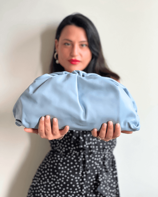 • Borsa a mano clutch azzurro pastello in tessuto morbido, stile minimal e raffinato, perfetta per eventi eleganti o outfit serali. Indossata con abito nero a pois.