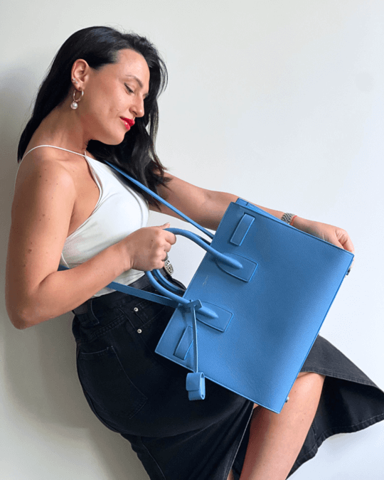 • Borsa a spalla Saint Laurent Sac de Jour blu in pelle martellata, design strutturato con manici doppi e tracolla, ideale per look professionali o casual chic. Indossata con top bianco e gonna nera.