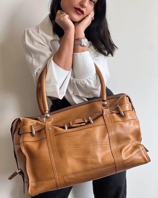 • Borsa da viaggio in pelle marrone cuoio con manici rinforzati e dettagli in metallo, stile vintage ed elegante, ideale per weekend o viaggi business. Indossata con camicia bianca classica.