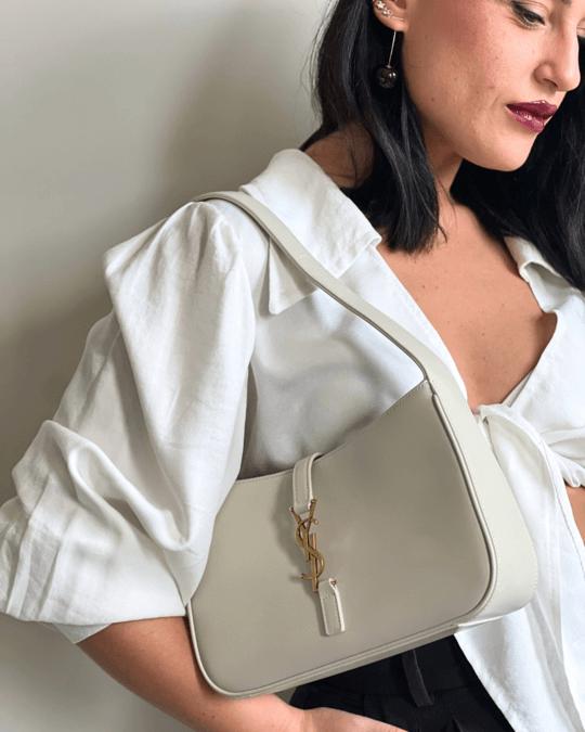• Borsa a spalla Saint Laurent in pelle beige con logo YSL dorato, design strutturato ed elegante, perfetta per look da giorno o da sera. Indossata con camicia bianca dal taglio femminile.