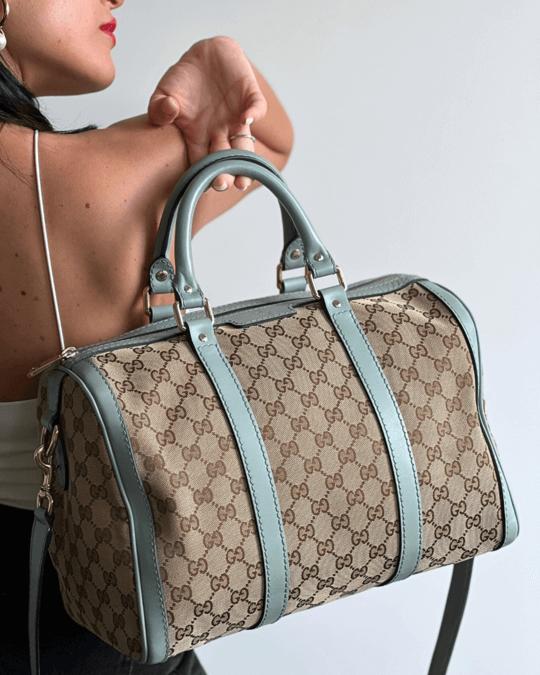 • Borsa bauletto Gucci in tela GG Supreme beige con dettagli in pelle azzurro pastello, manici doppi e tracolla regolabile, stile elegante e versatile per tutti i giorni.