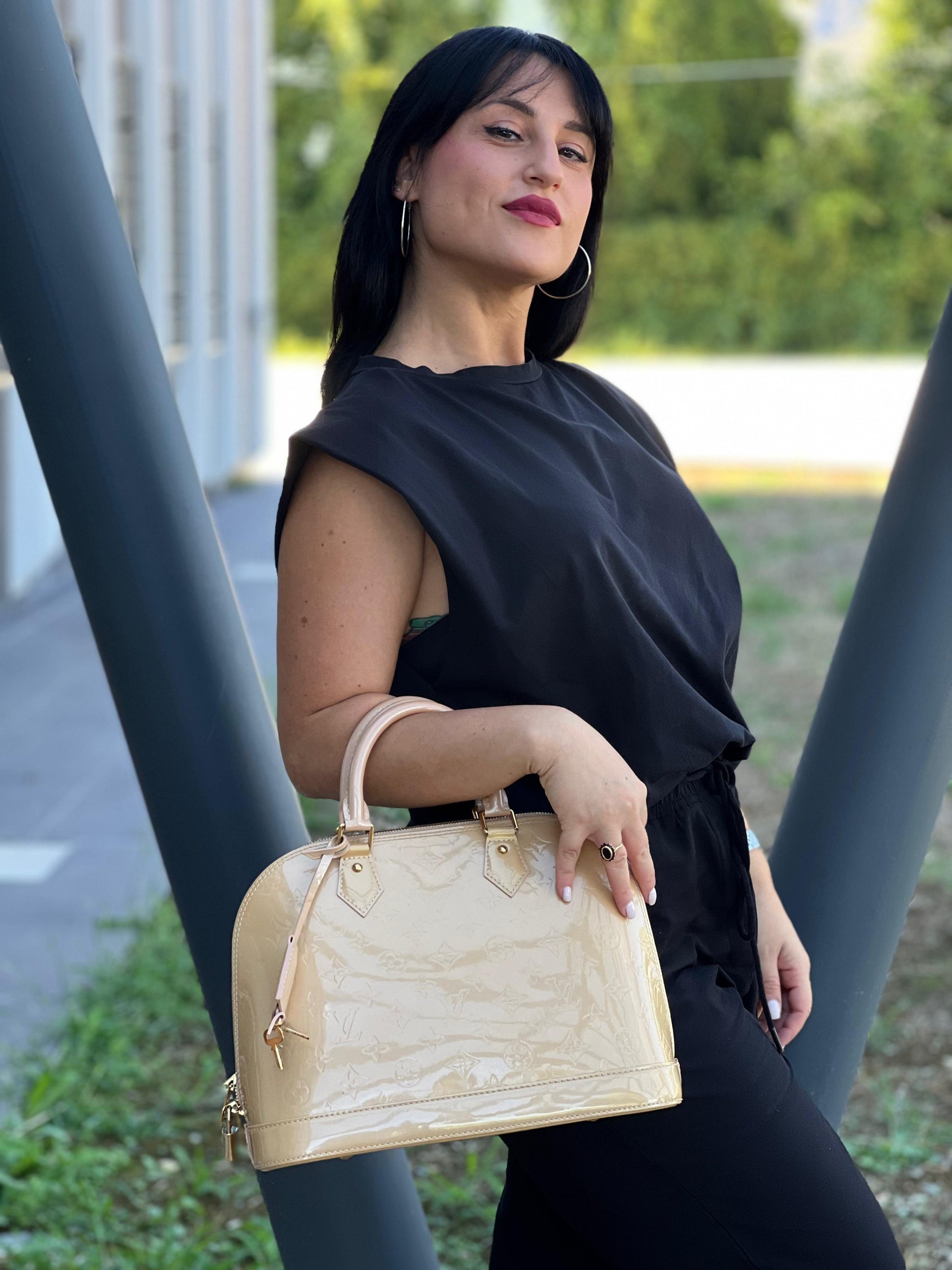Descrizione: Alma PM Louis Vuitton in pelle Vernis color noisette con parti metalliche dorate e doppi manici stondati; da portare a mano.