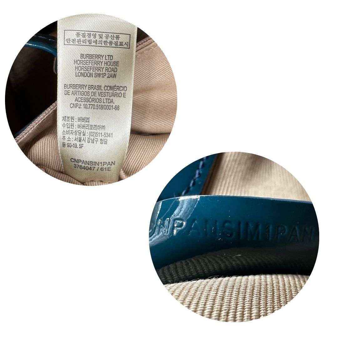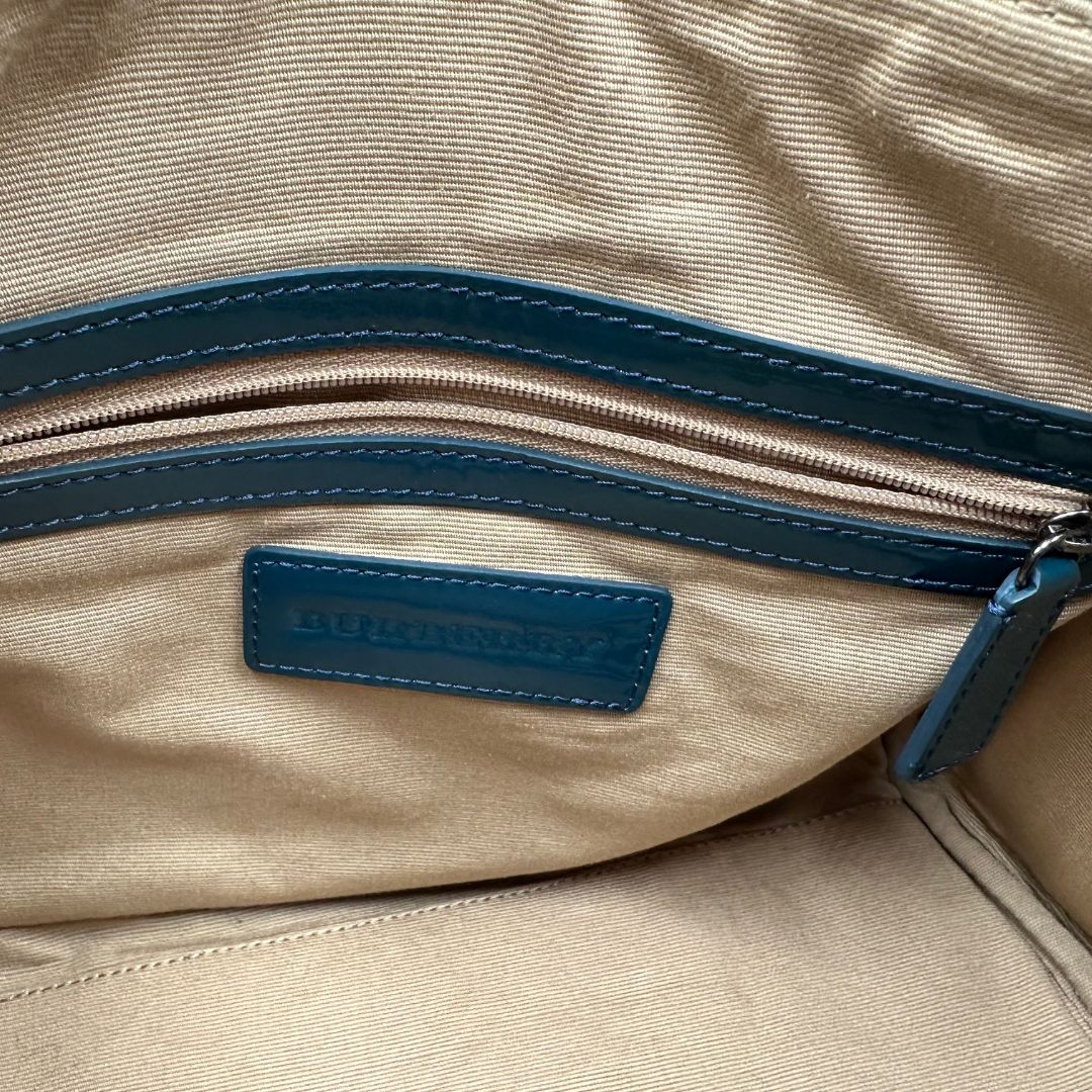 Descrizione: Borsa Burberry in canvas beige tartan con finiture in pelle lucida color verde petrolio e parti metalliche effetto renio. Munita di doppi manici stondati. Completa di dustbag.