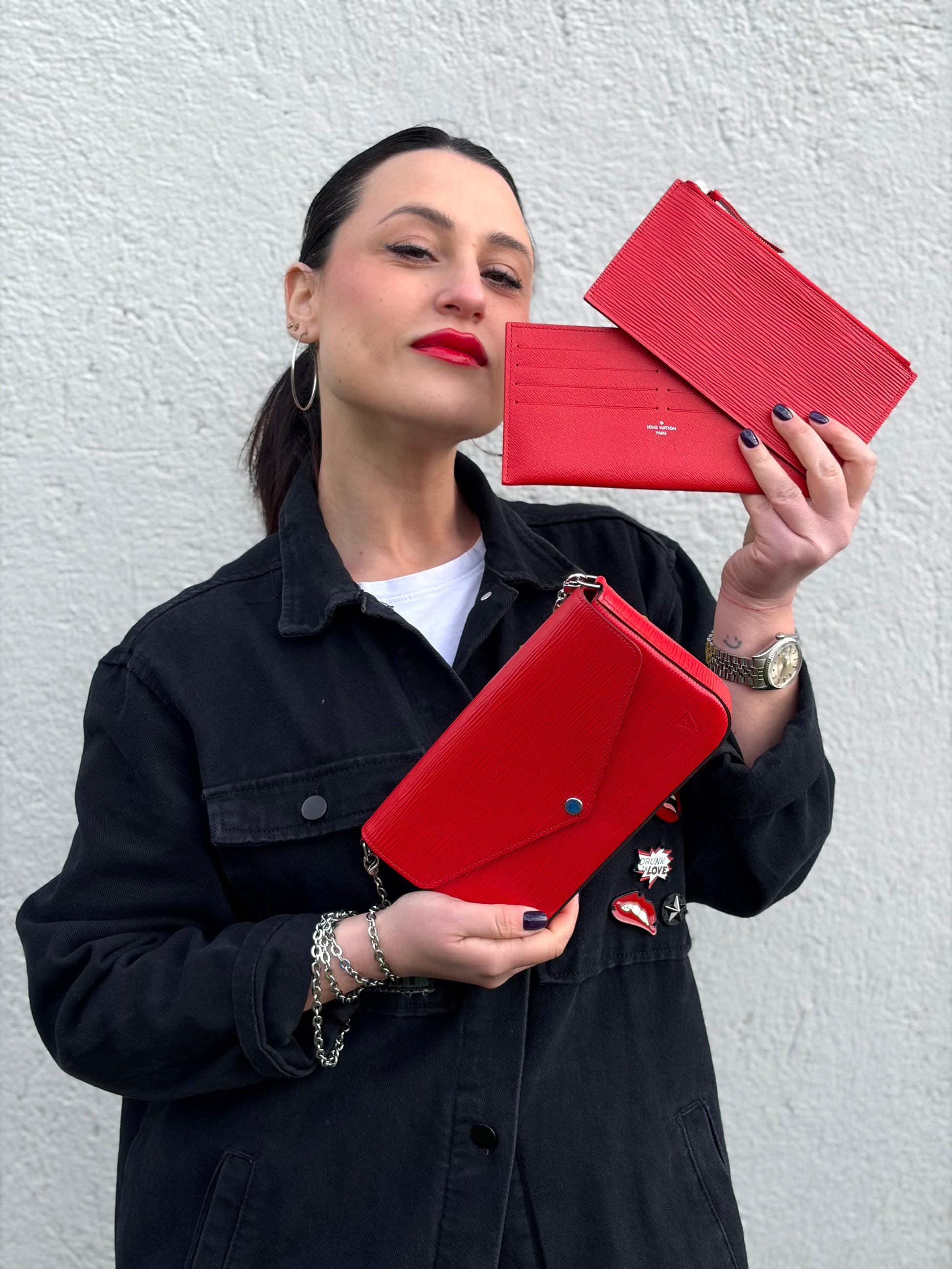 Descrizione: Borsa Louis Vuitton Félicie in pelle epi rossa con parti metalliche argentate; munita di una tracolla in catena amovibile e accessori portacarte e portamonete estraibili. Completa di dustbag e scatola.