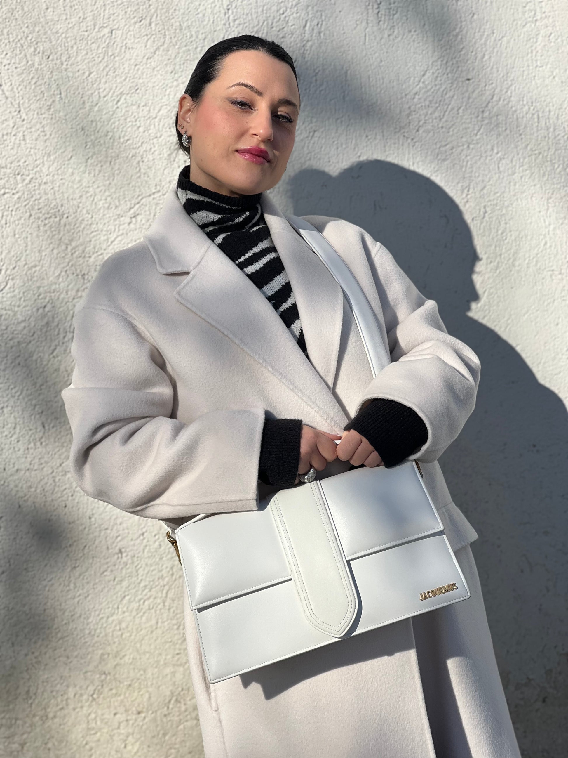 Descrizione: Borsa Jacquemus in pelle bianca con parti metalliche dorate; munita di un manico singolo e una tracolla amovibile. Completa di dustbag.