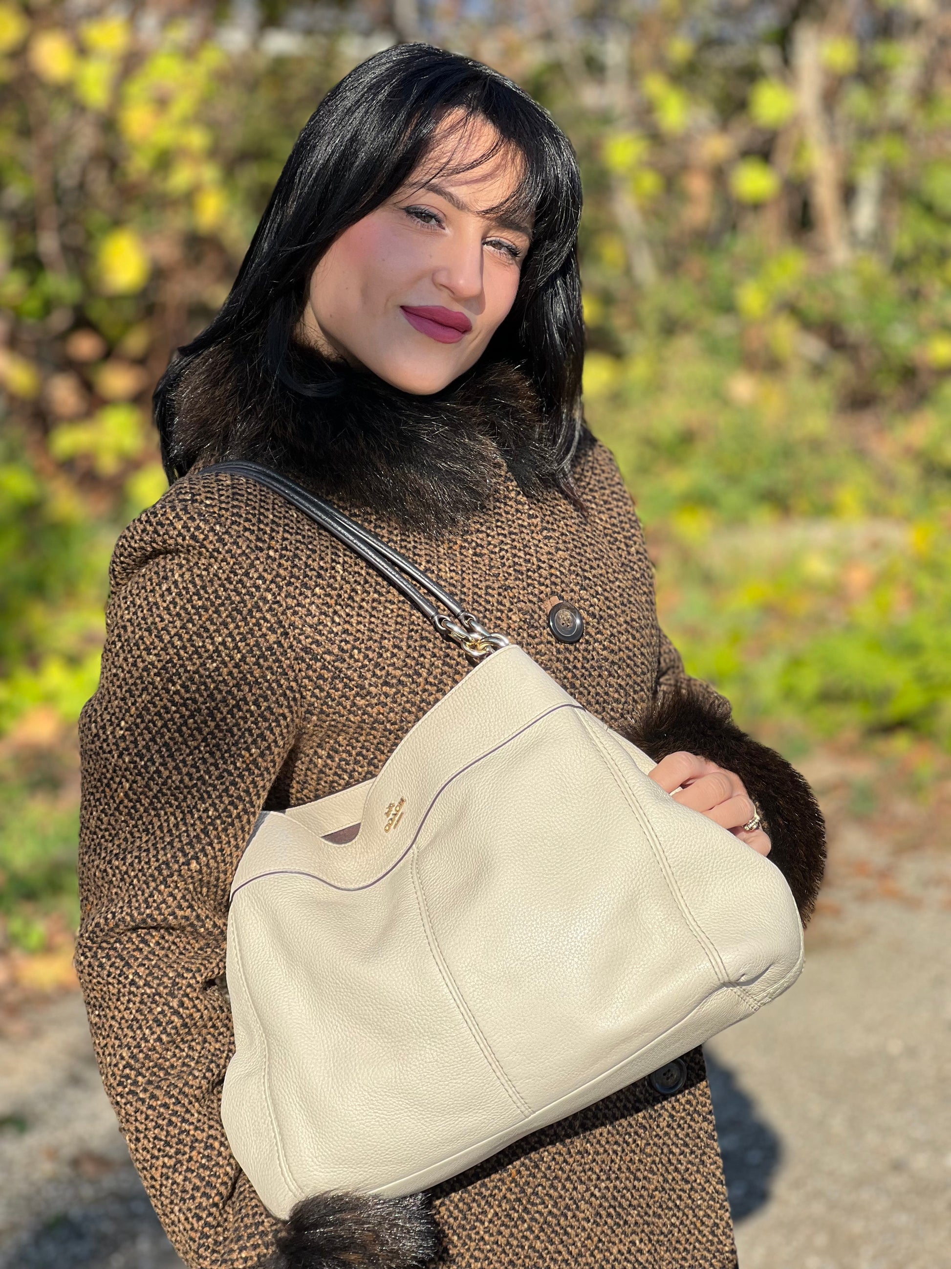 Descrizione: Borsa Coach in pelle martellata color bianco avorio con parti metalliche dorate; munita di doppi manici in pelle nera e marrone, da indossare a spalla.