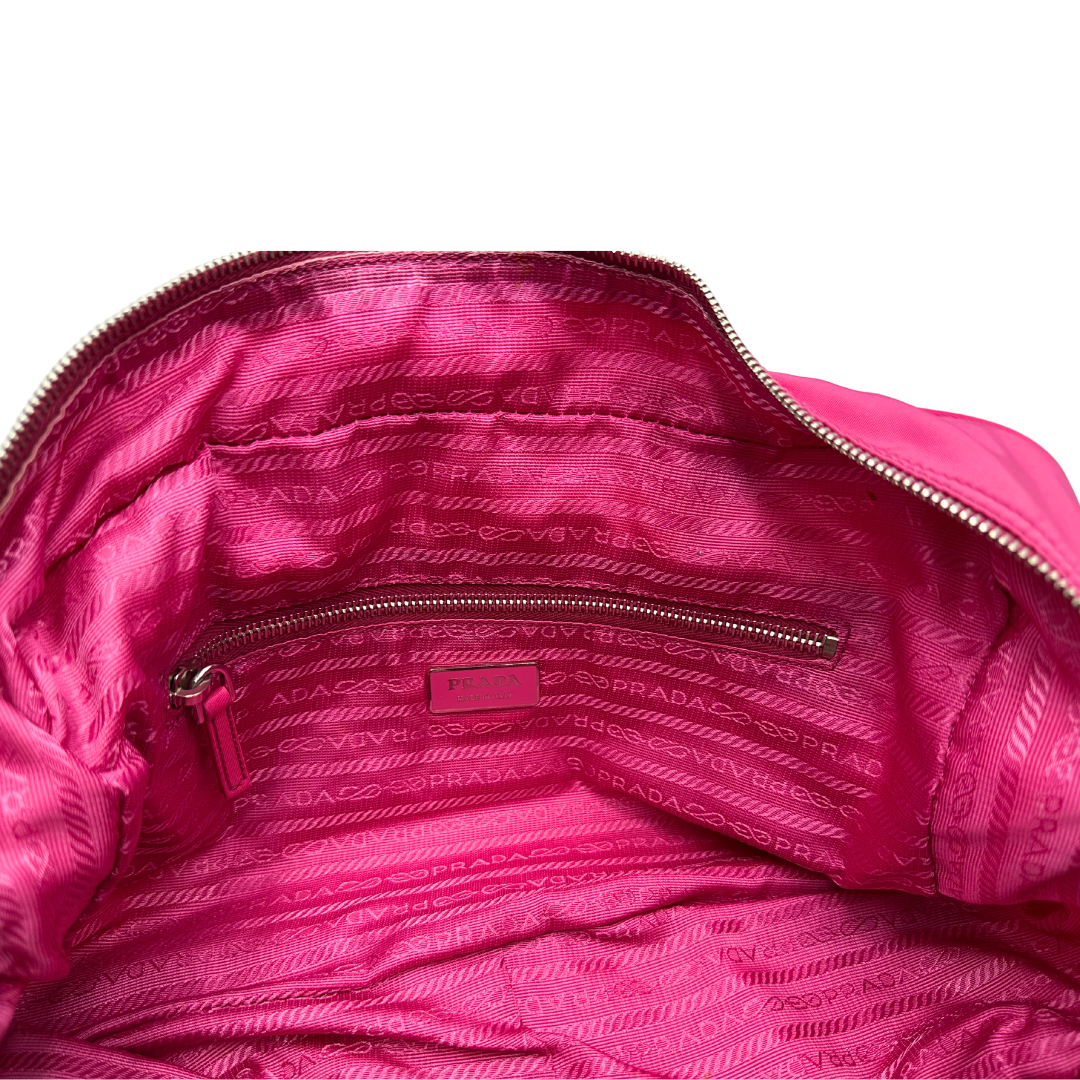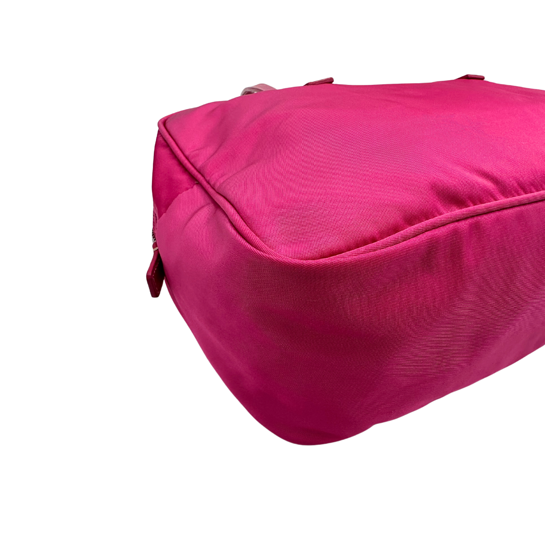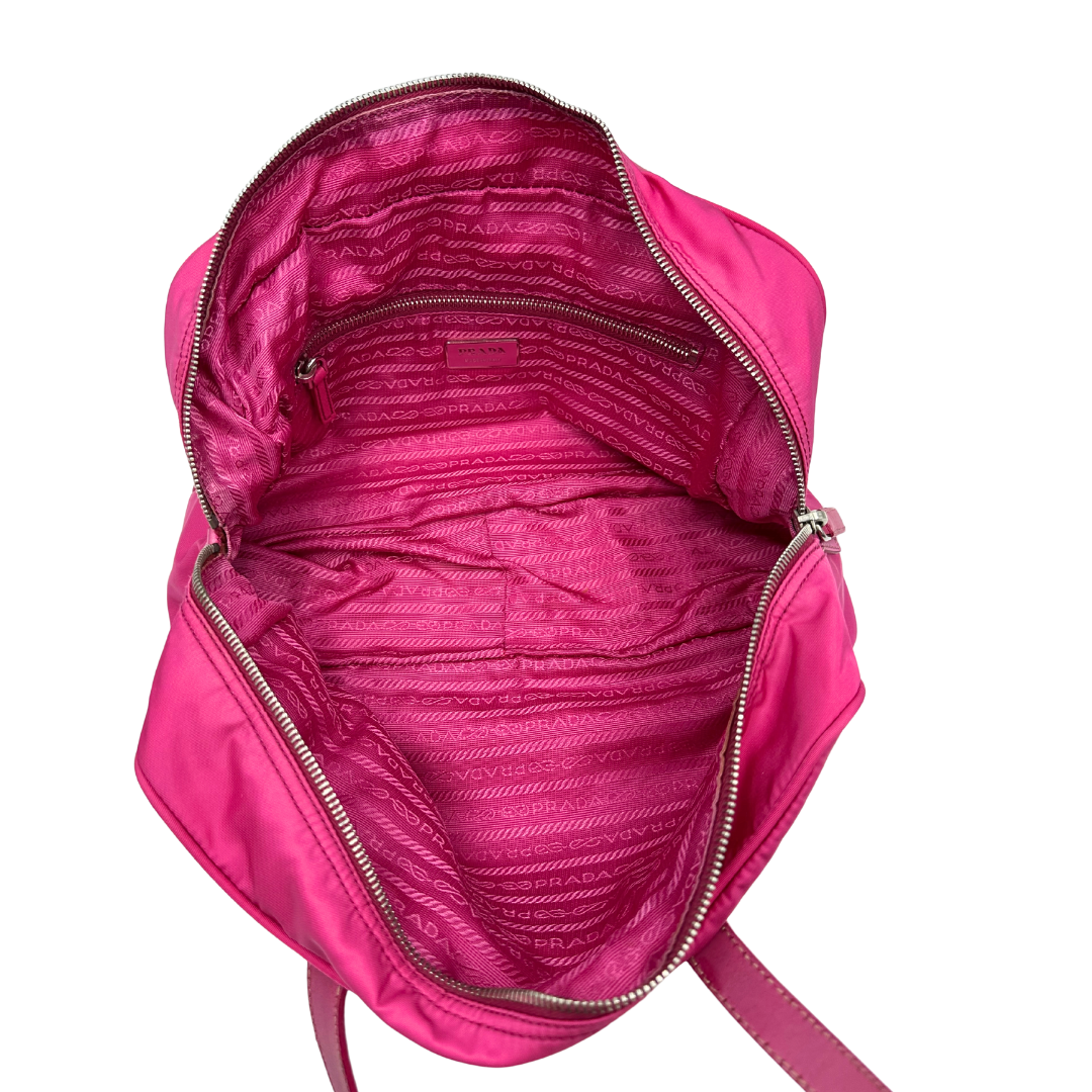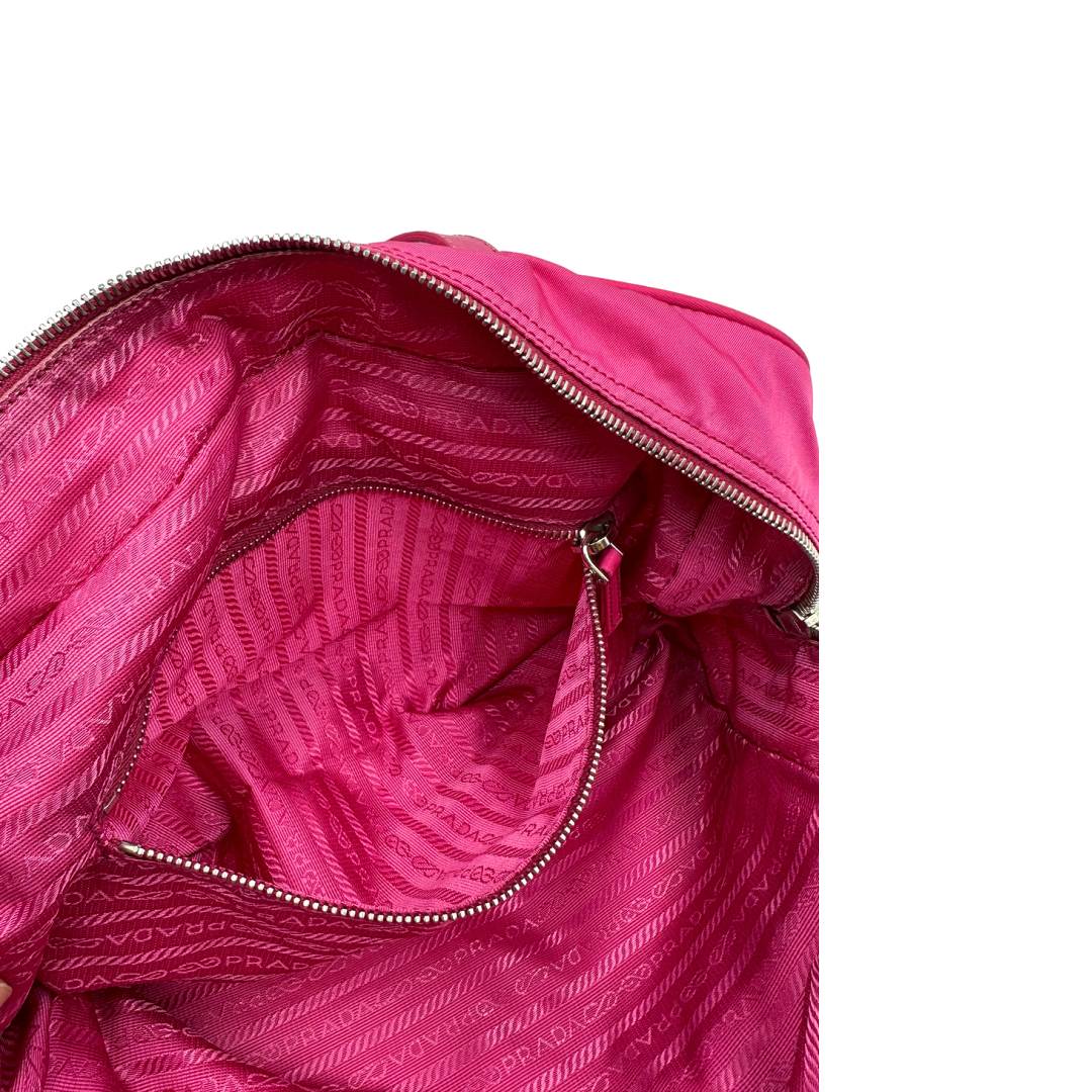 Descrizione: Borsa Prada in nylon fucsia con finiture in pelle tono su tono e parti metalliche argentate. Completa di dustbag e card d'autenticità.