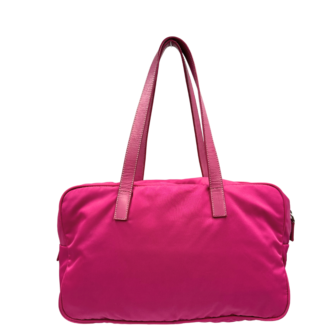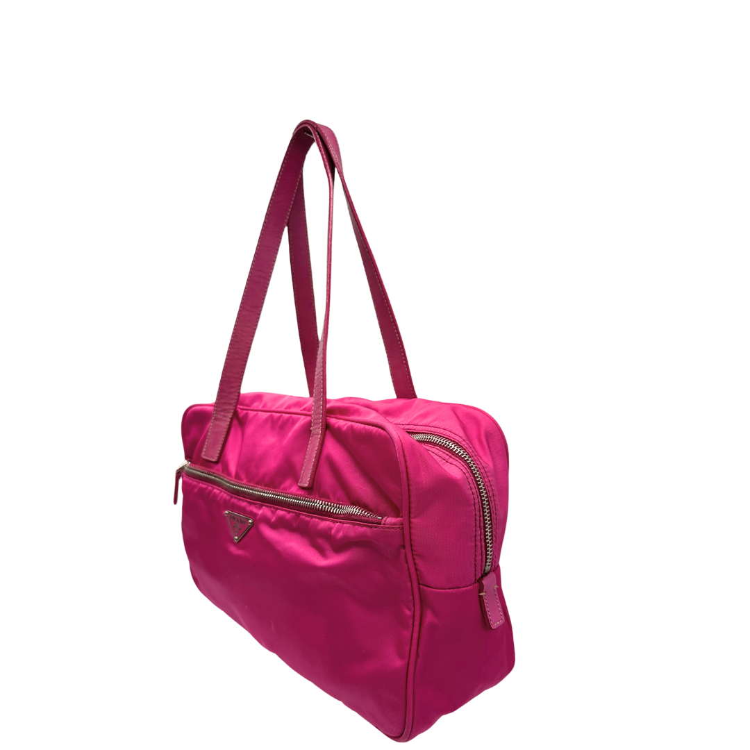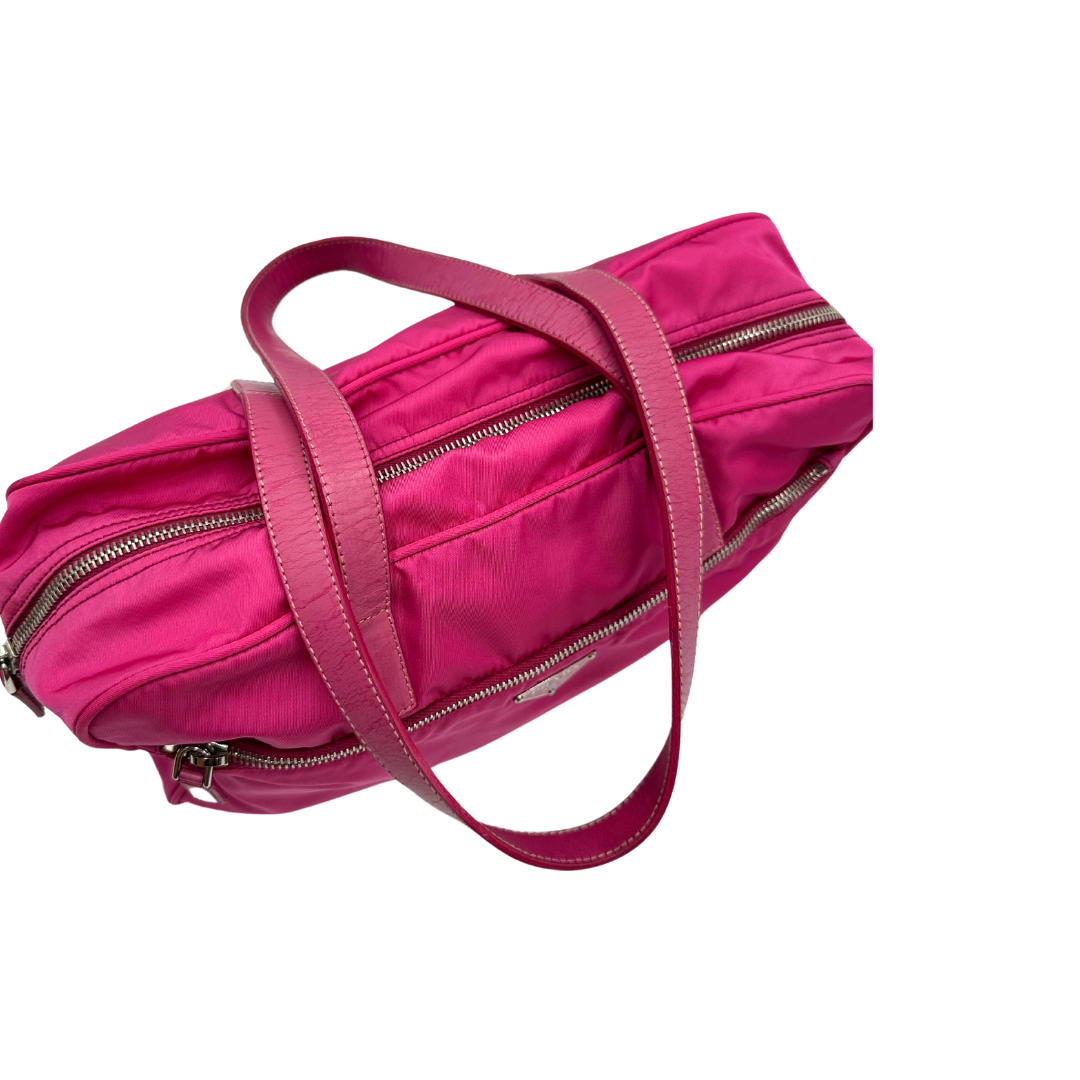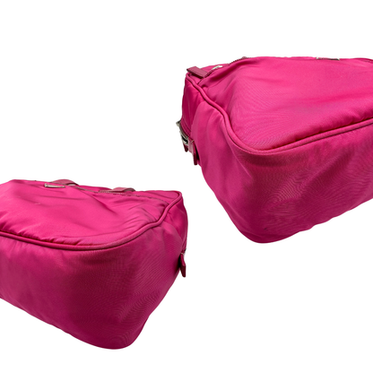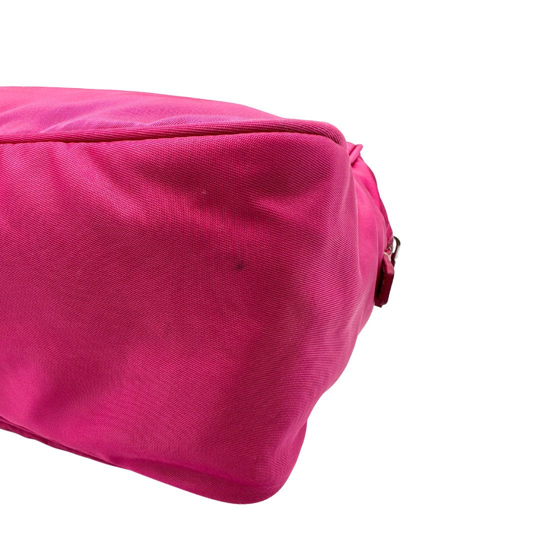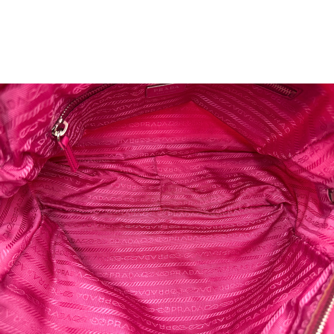 Descrizione: Borsa Prada in nylon fucsia con finiture in pelle tono su tono e parti metalliche argentate. Completa di dustbag e card d'autenticità.