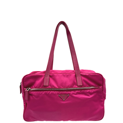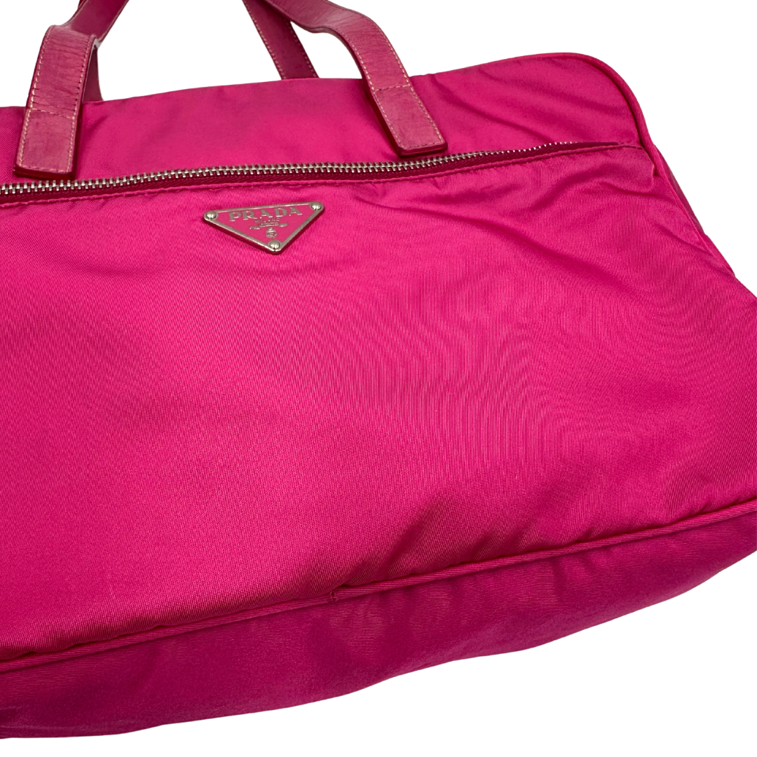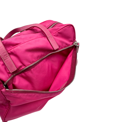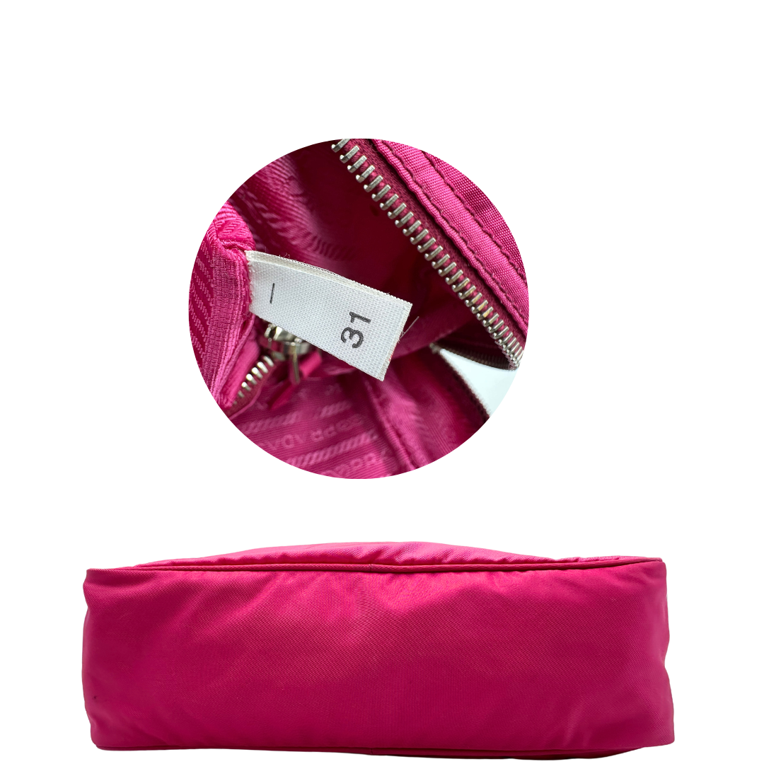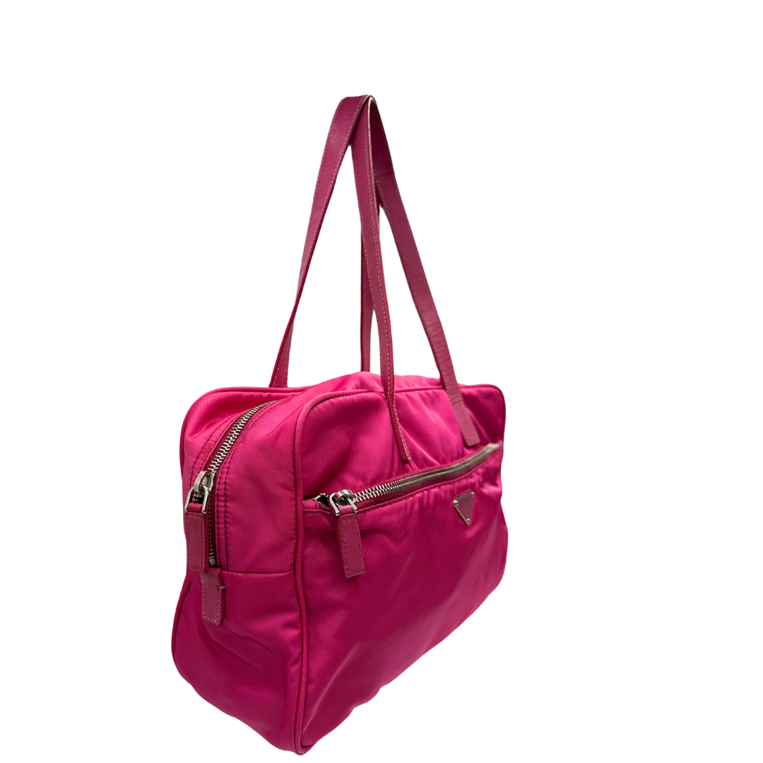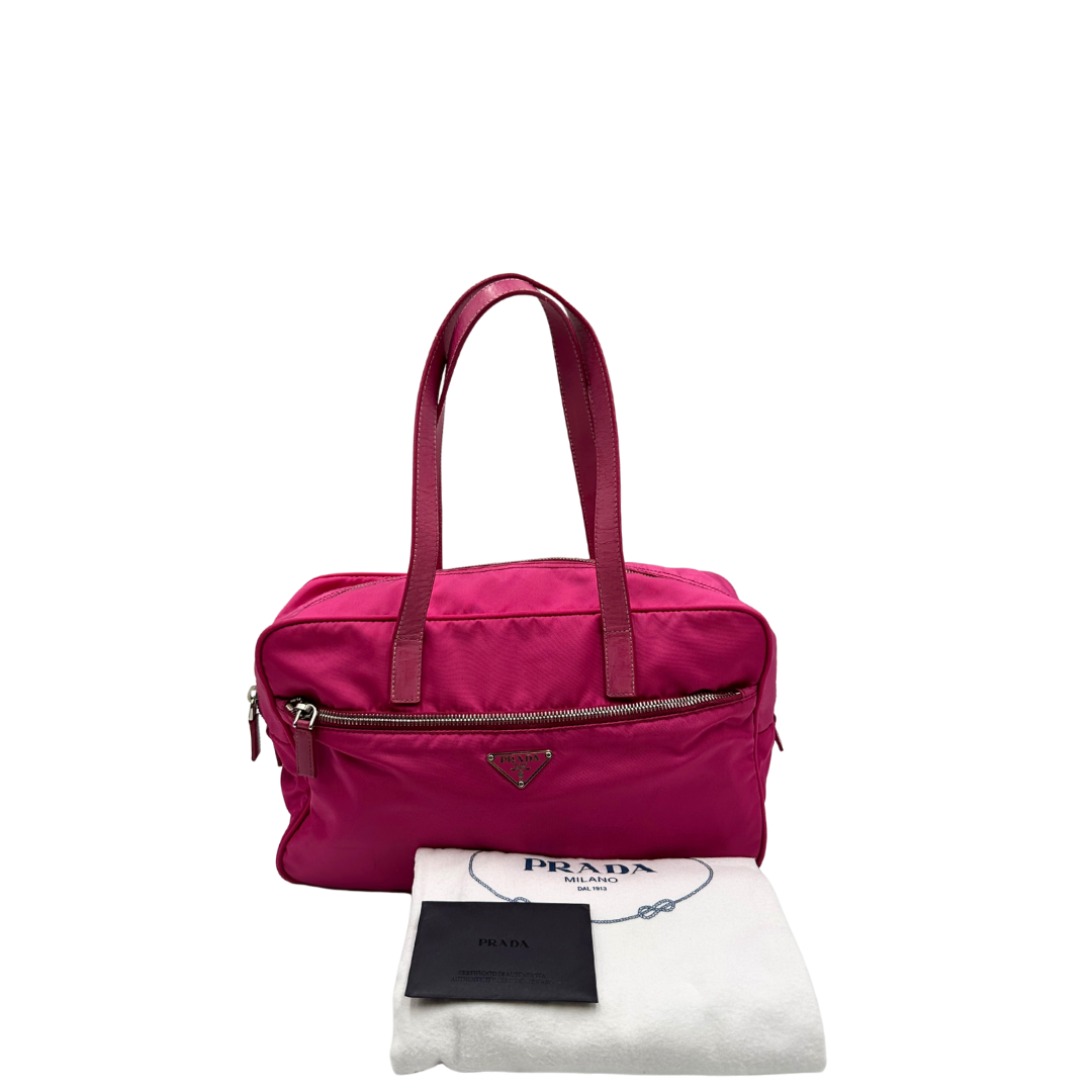 Descrizione: Borsa Prada in nylon fucsia con finiture in pelle tono su tono e parti metalliche argentate. Completa di dustbag e card d'autenticità.