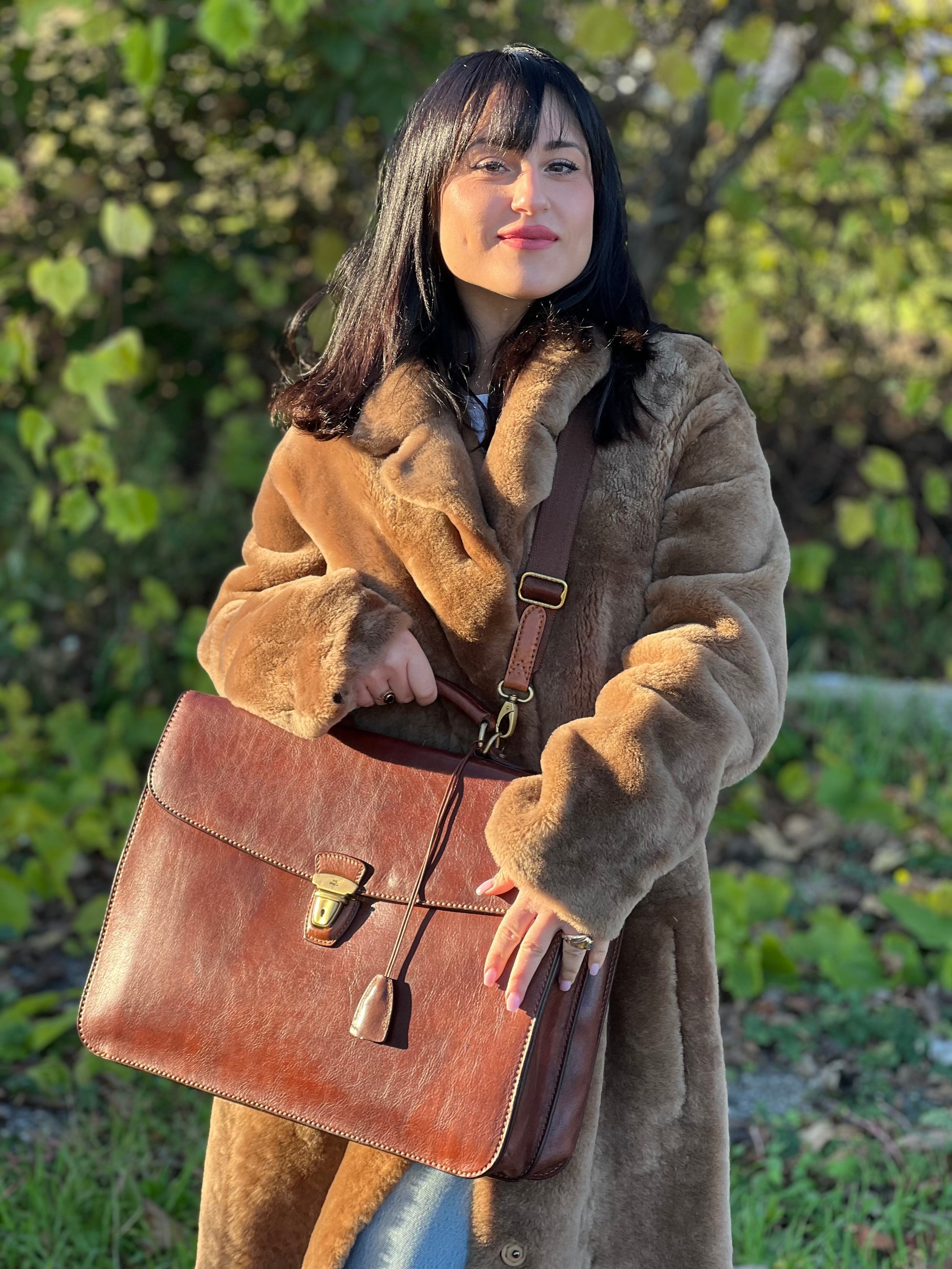 Descrizione: Cartella The Bridge in cuoio marrone con parti metalliche oro anticato; dotata di manico, una tracolla regolabile e amovibile e una clochette portachiavi.