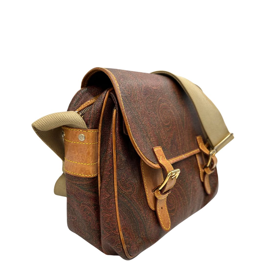 Descrizione: Borsa Etro in canvas trama Paisley con finiture in pelle color cammello e parti metalliche dorate; munita di una tracolla in tessuto regolabile.