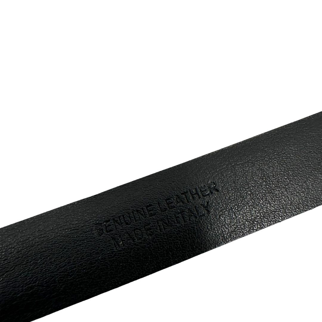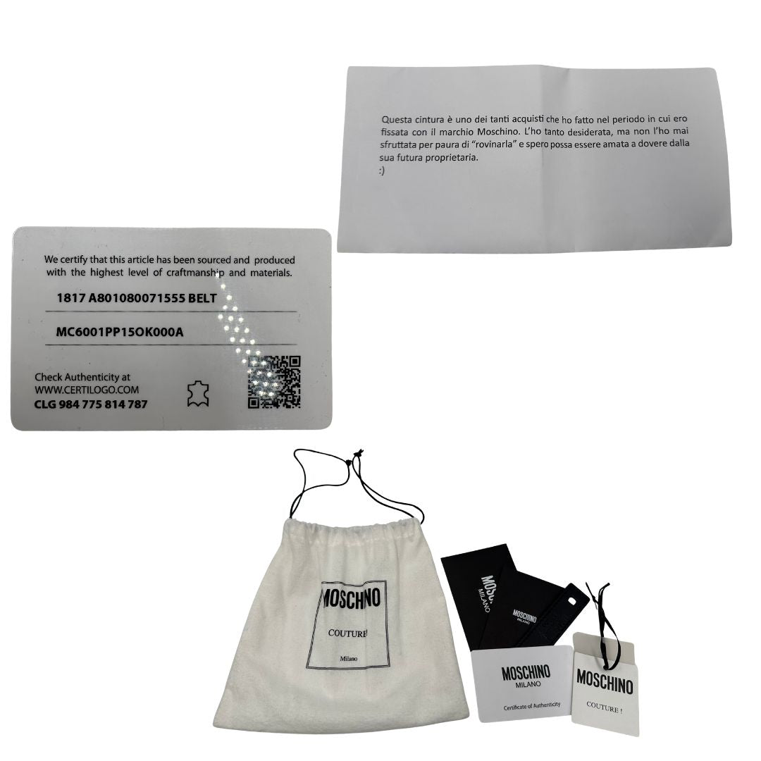 Descrizione: Cintura Moschino in pelle nera con parti metalliche argentate. Completa di sacchetto e cartellini