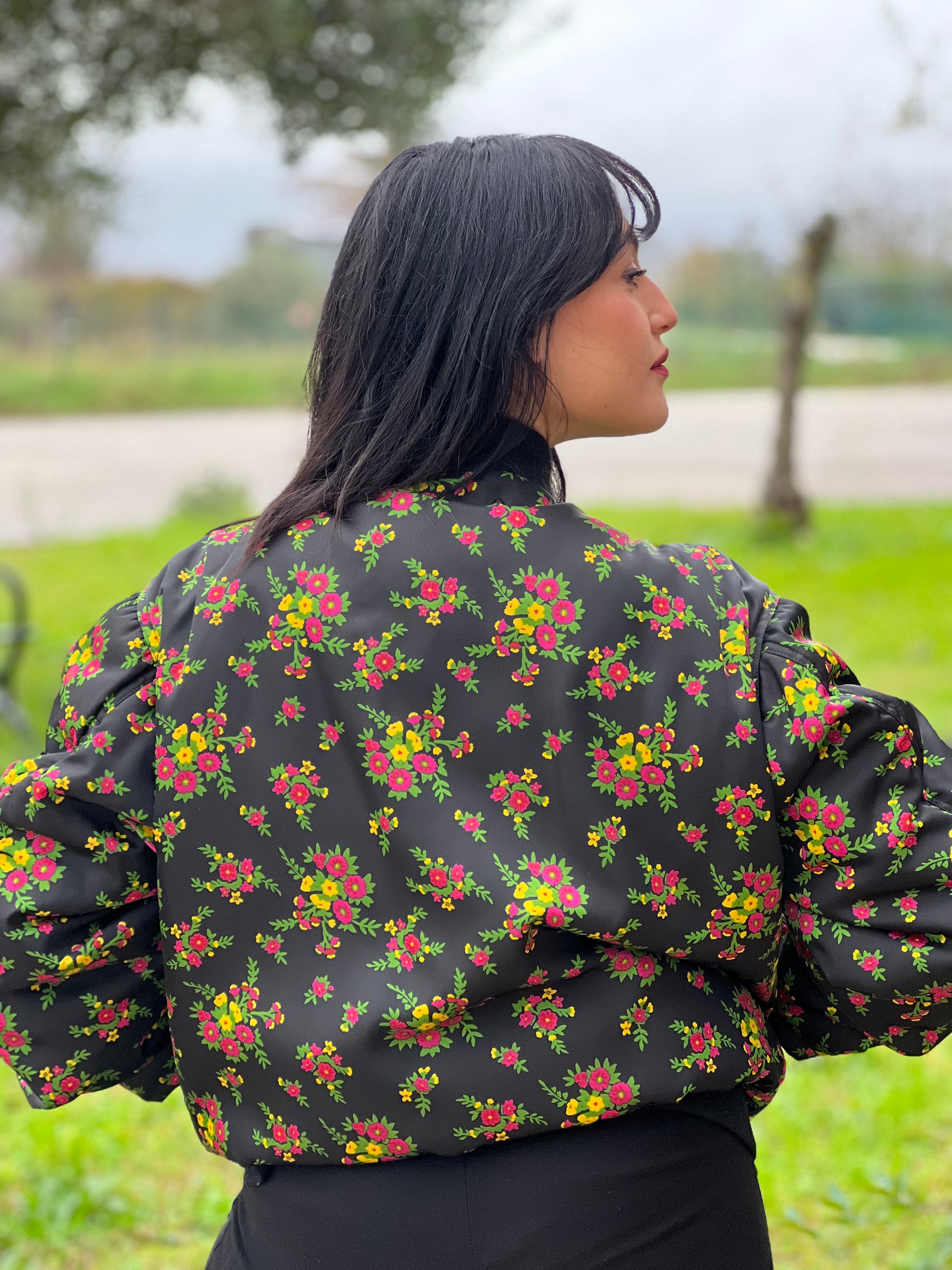 • Tessuto nero + Trama floreale multicolore in 100% Poliammide