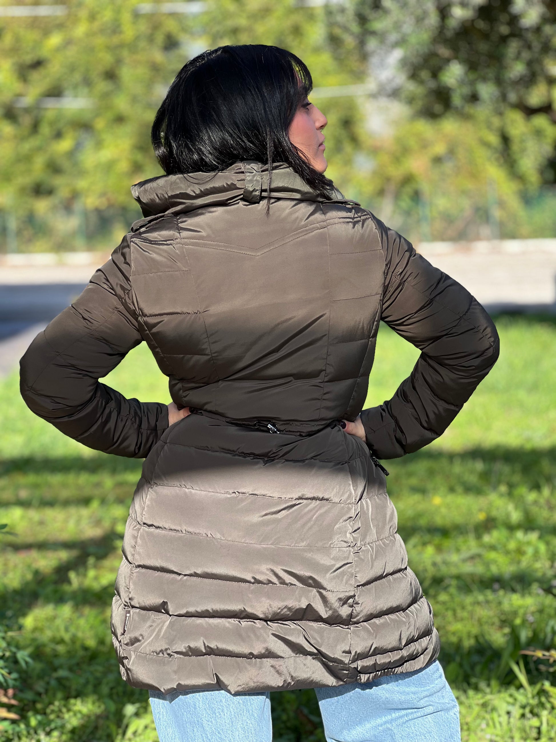 Descrizione: Piumino Moncler in 100% poliestere verde oliva grigiastro a doppia chiusura con bottoni e cerniera.