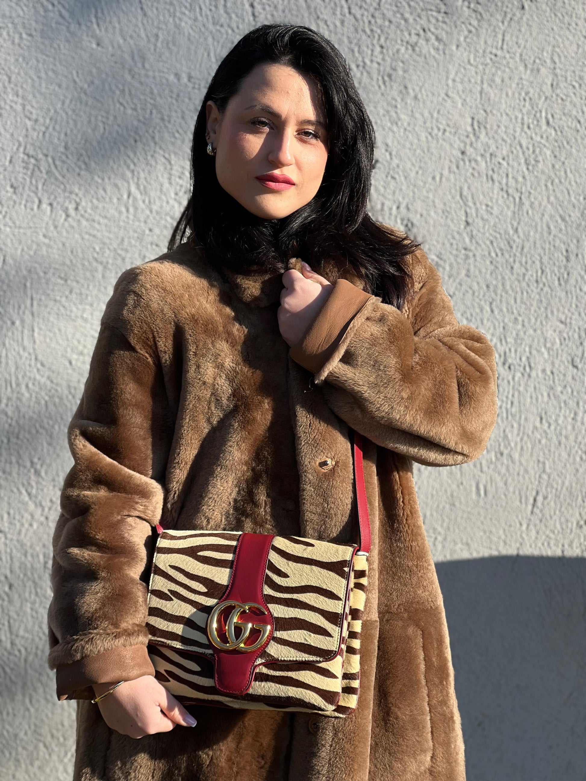 Descrizione: Borsa Gucci effetto pelo con trama animalier, rifiniture in pelle rossa e parti metalliche dorate; munito di tracolla regolabile. Completa di dustbag e cartellini.