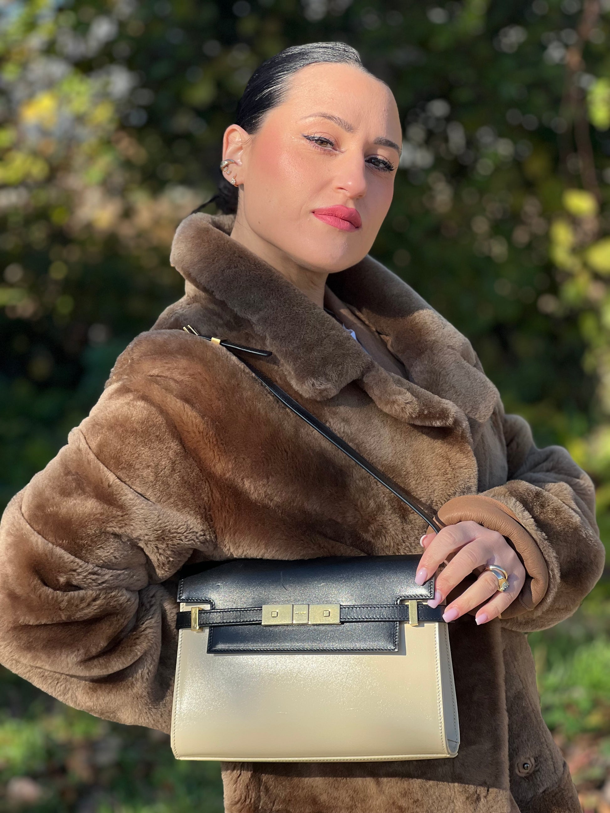 Descrizione: Borsa Manhattan Saint Laurent in pelle beige e nera con parti metalliche dorate. Completa di dustbag.