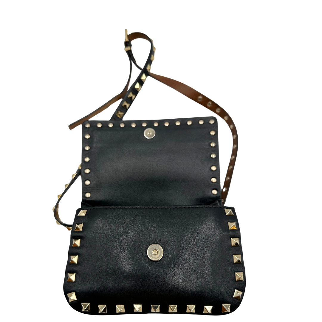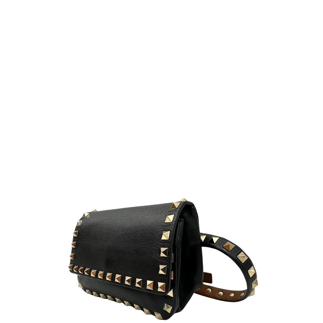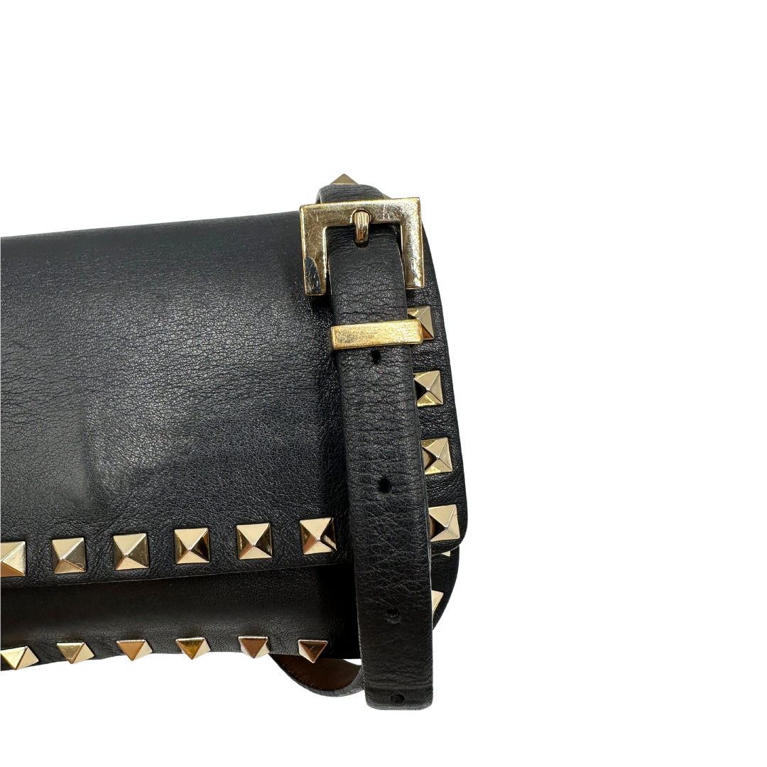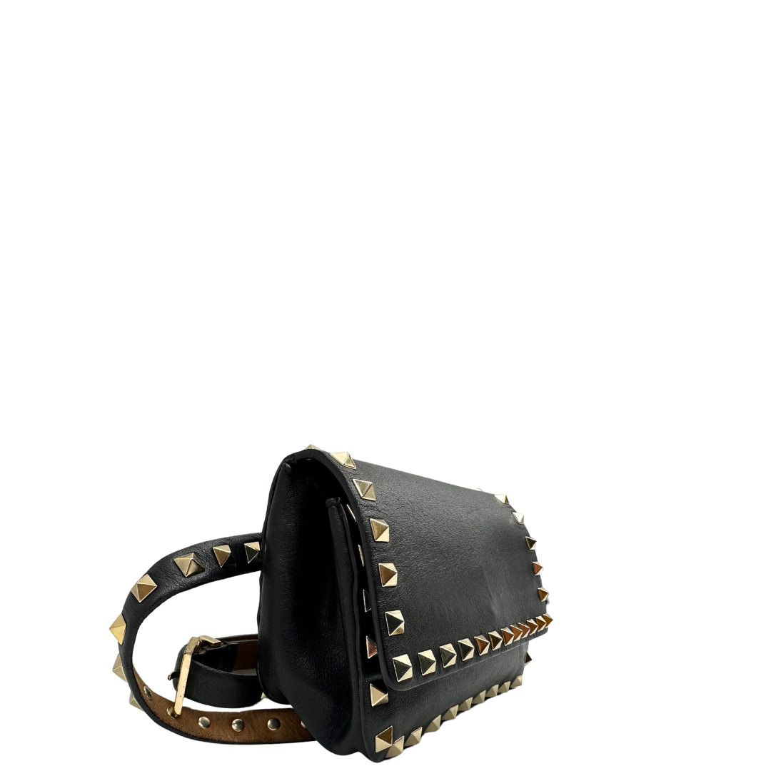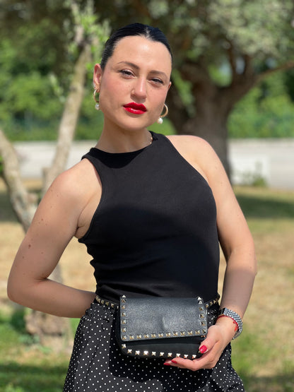 Descrizione: Marsupio V. G.  in pelle nera rifinita con parti metalliche dorate e impreziosito da borchie piramidali lungo i bordi. Completo di dustbag.