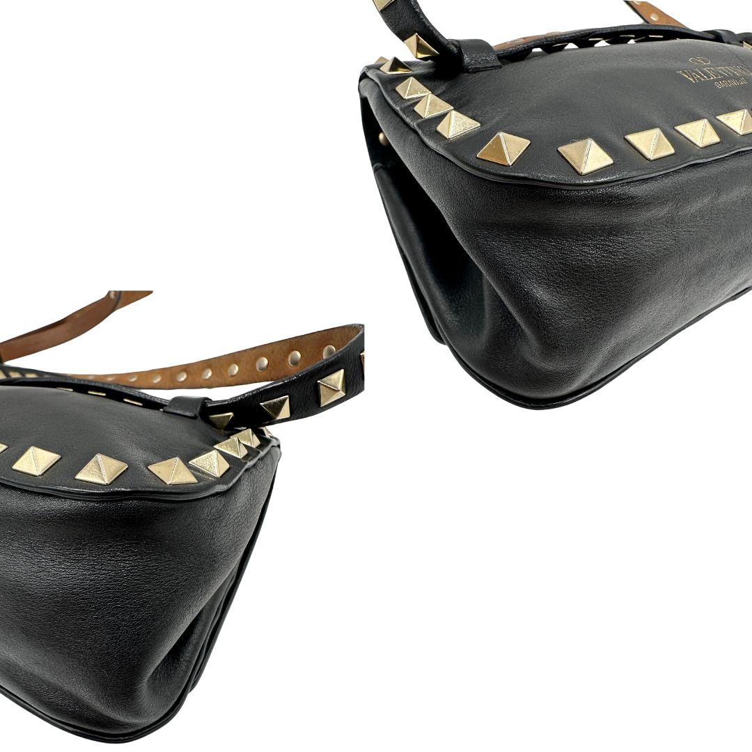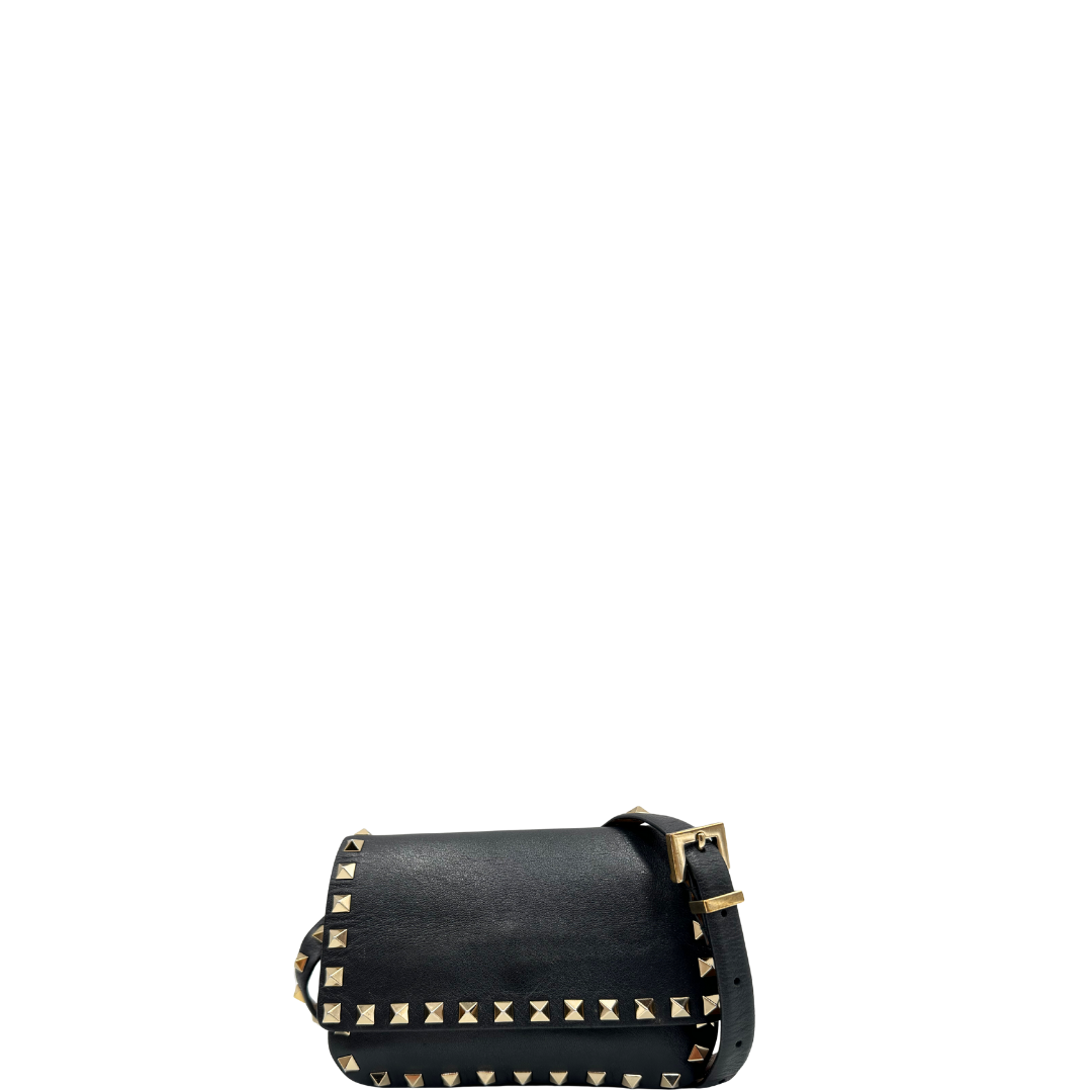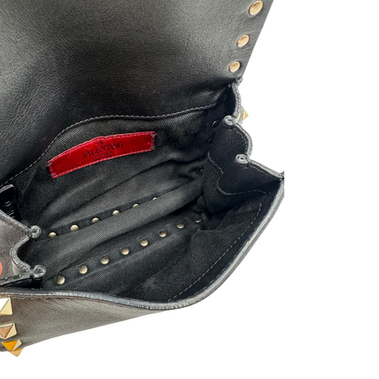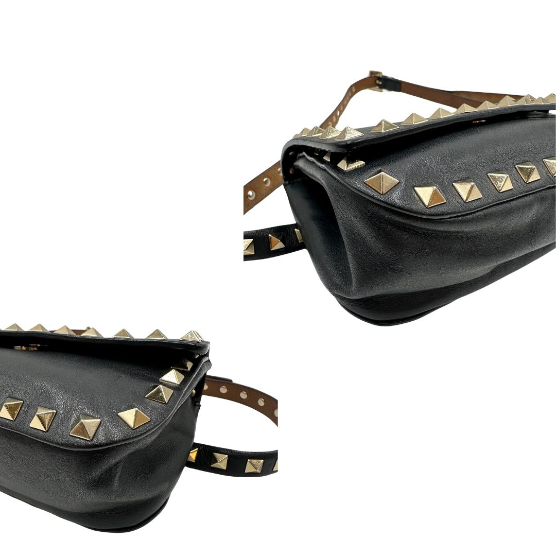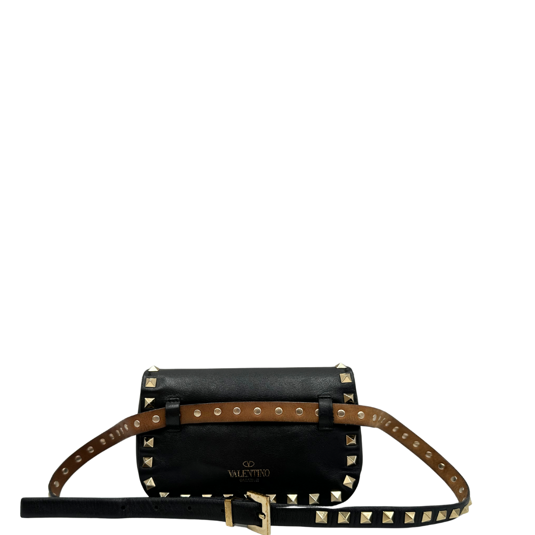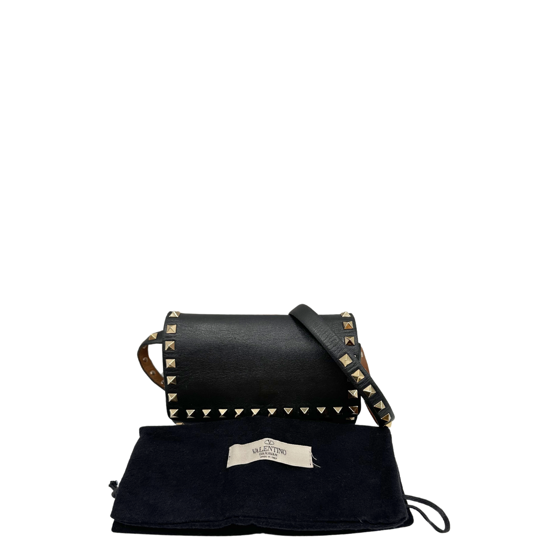 Descrizione: Marsupio V. G.  in pelle nera rifinita con parti metalliche dorate e impreziosito da borchie piramidali lungo i bordi. Completo di dustbag.