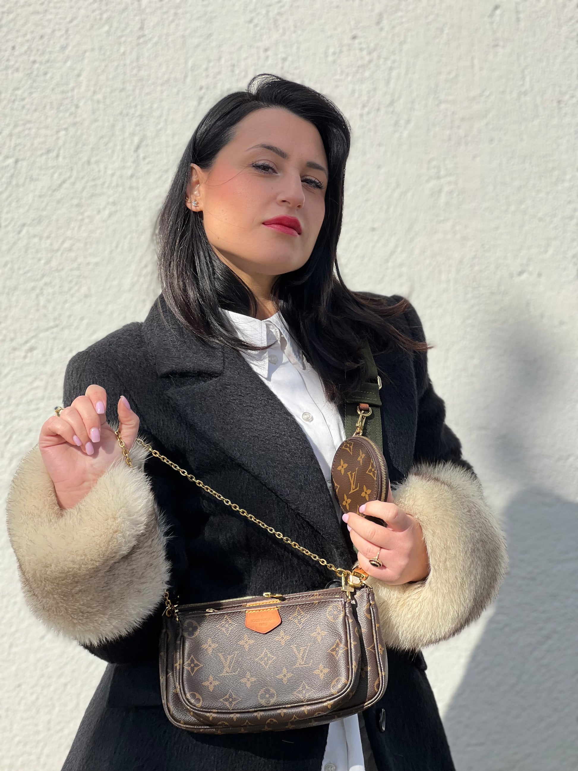 Descrizione: Iconica Multi Pochette Accessoires Louis Vuitton in canvas marrone monogram con dettagli in vacchetta naturale, manico in catena dorata e tracolla in tessuto Jacquard verde kaki. Dotata del classico mini portamonete rotondo, rimovibile.