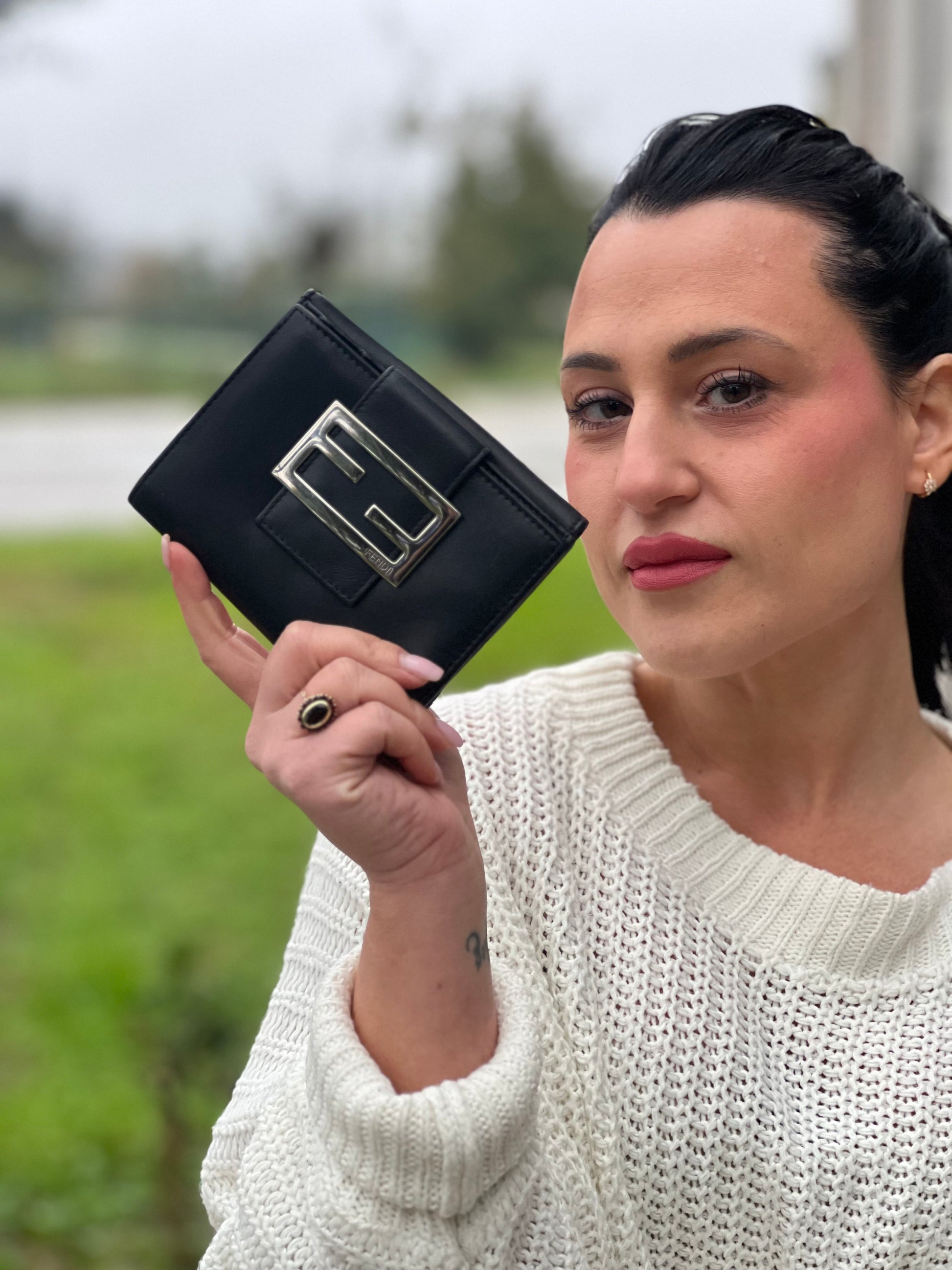 Descrizione: Portafoglio Fendi in pelle nera con logo doppie F sul front e con parti metalliche argentate.
