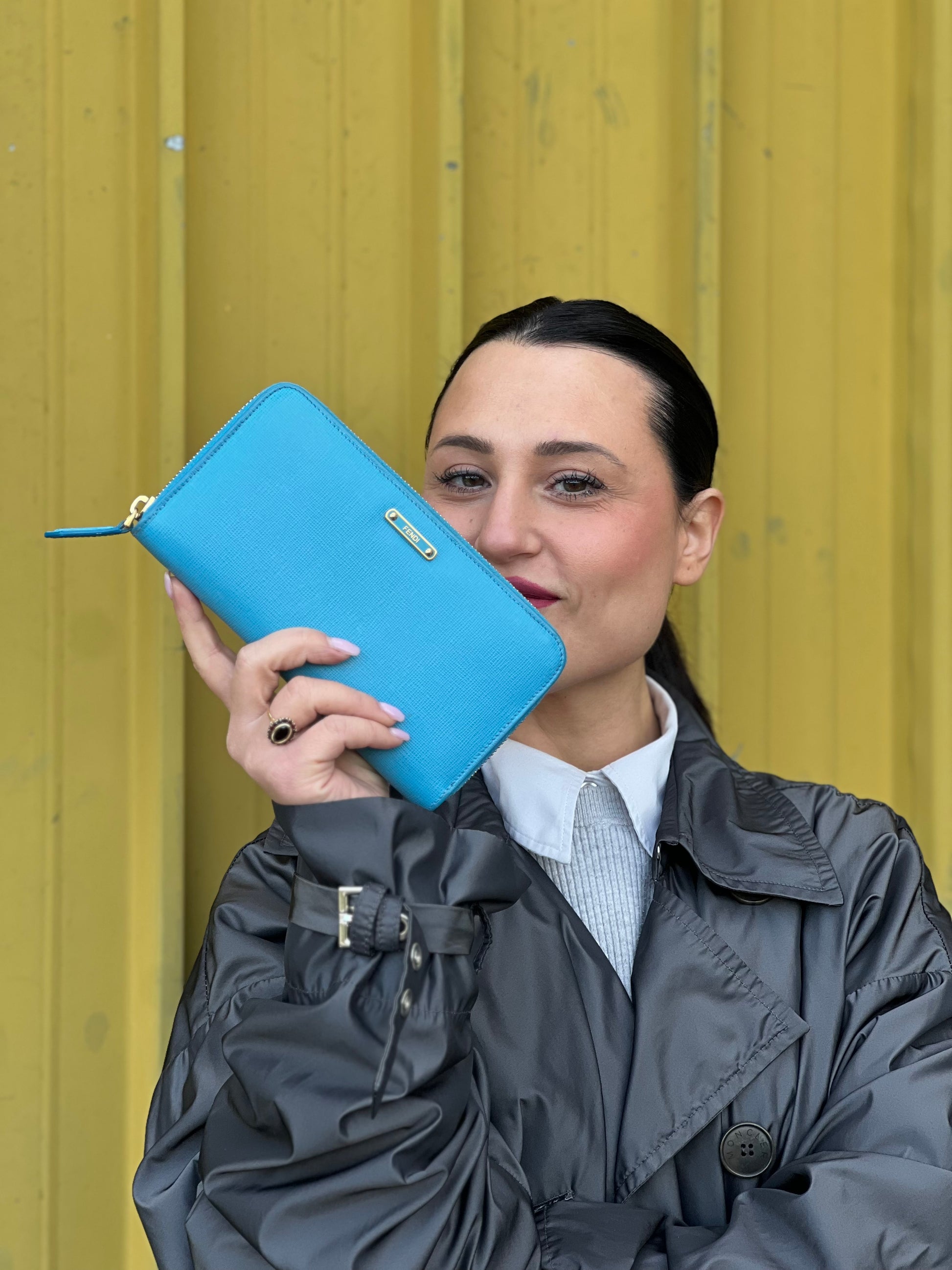 Portafoglio Fendi in pelle saffiano turchese con metalleria dorata e chiusura zip around. Fodera interna in pelle e tessuto, cinque scomparti, porta monete con zip e multi porta tessere. Nel corredo presente dustbag e scatola logata.