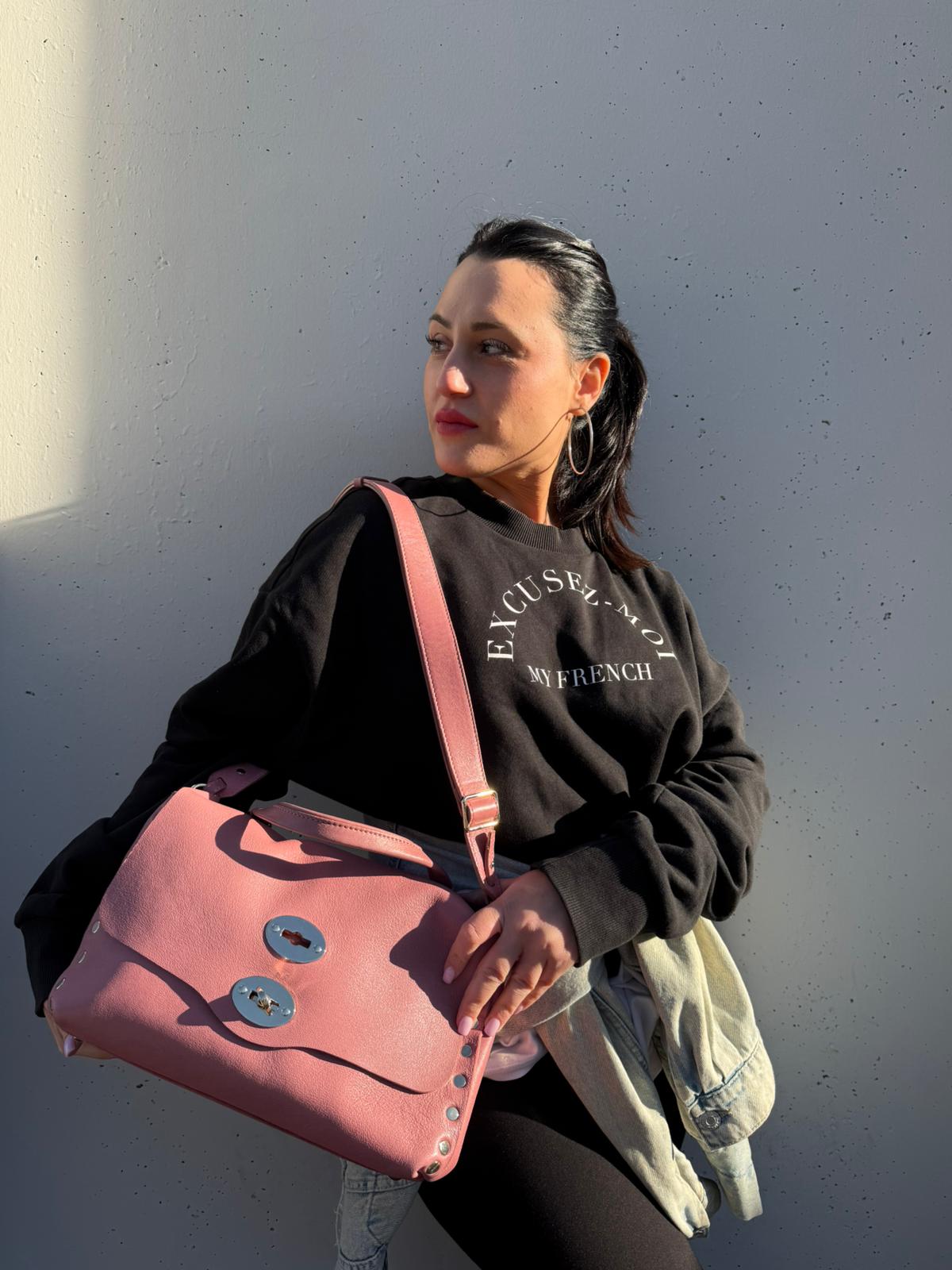 Descrizione: Borsa Zanellato in pelle rosa con parti metalliche in oro chiaro, munita di un manico singolo e una tracolla amovibile e regolabile. Munita di dustbag e cartellini.