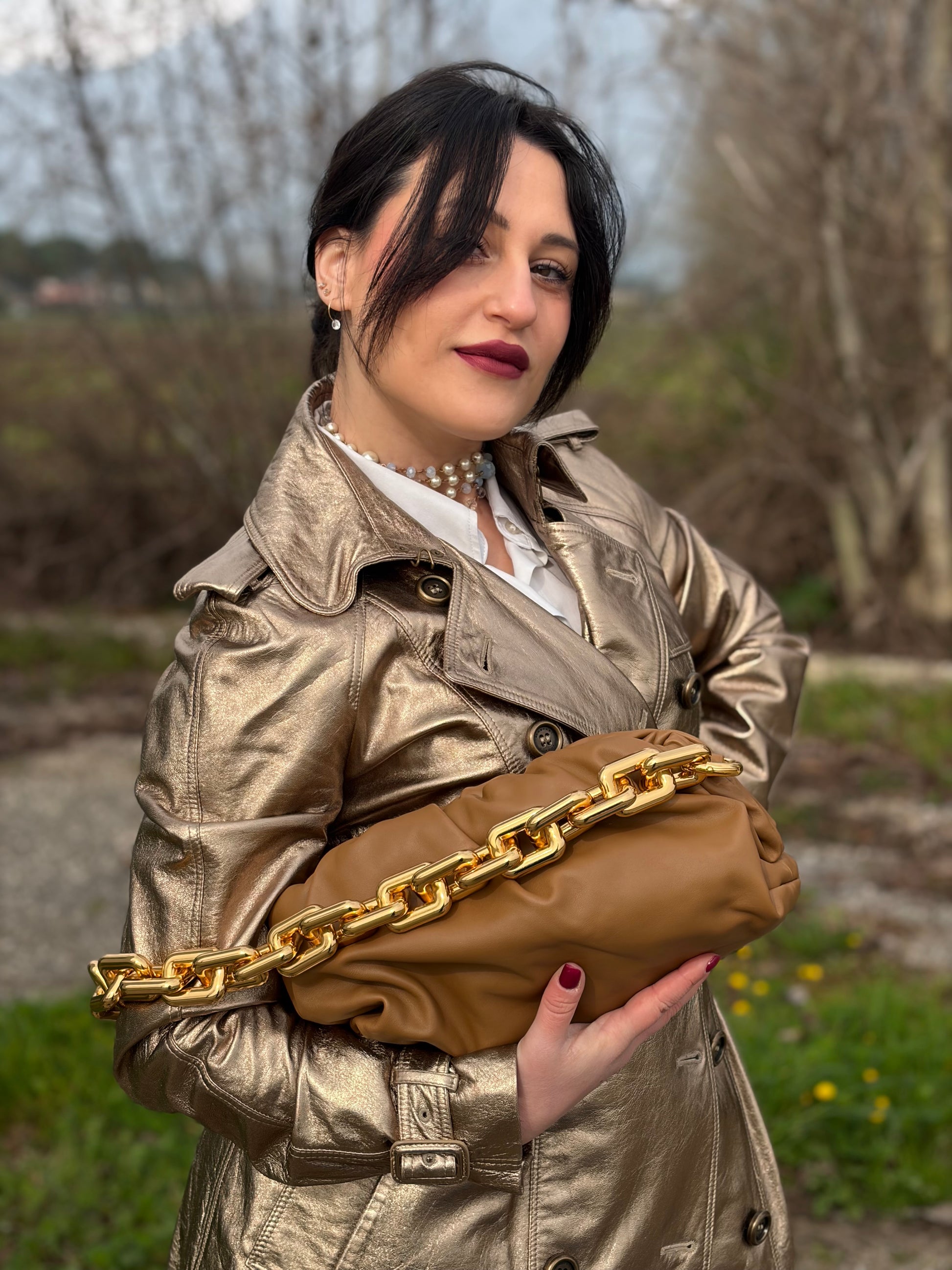 Descrizione: Borsa Pouch Bottega Veneta in pelle color caramello e maxi catena dorata.
