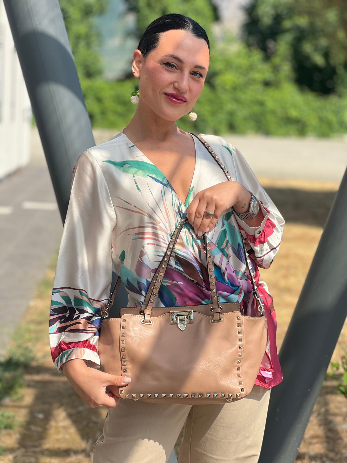 Descrizione: Borsa Valentino Garavani Rockstud in pelle rosa antico rifinita con borchie piramidali e parte metalliche dorate, munita di doppi manici e una tracolla amovibile non regolabile. Completa di Dustbag