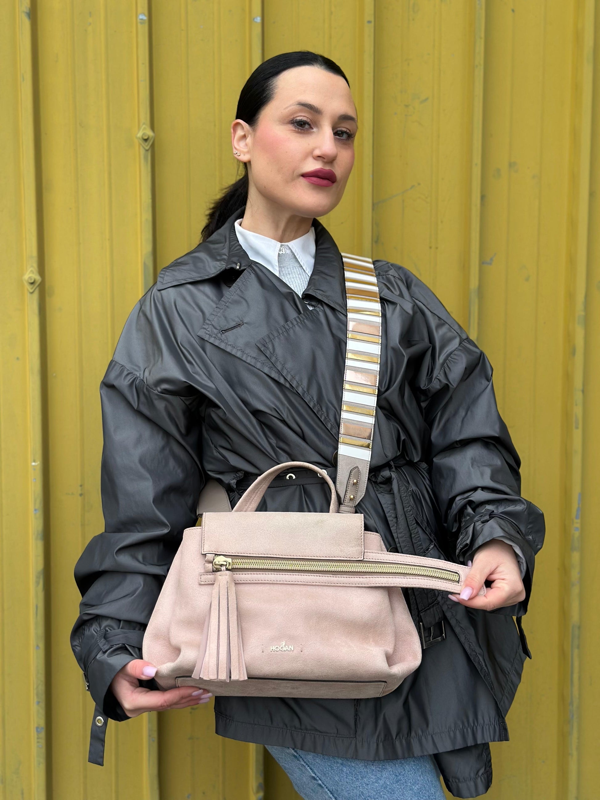 Descrizione: Borsa Hogan in pelle scamosciata rosa rifinita con parti metalliche dorate, munita di un manico singolo e una tracolla amovibile.