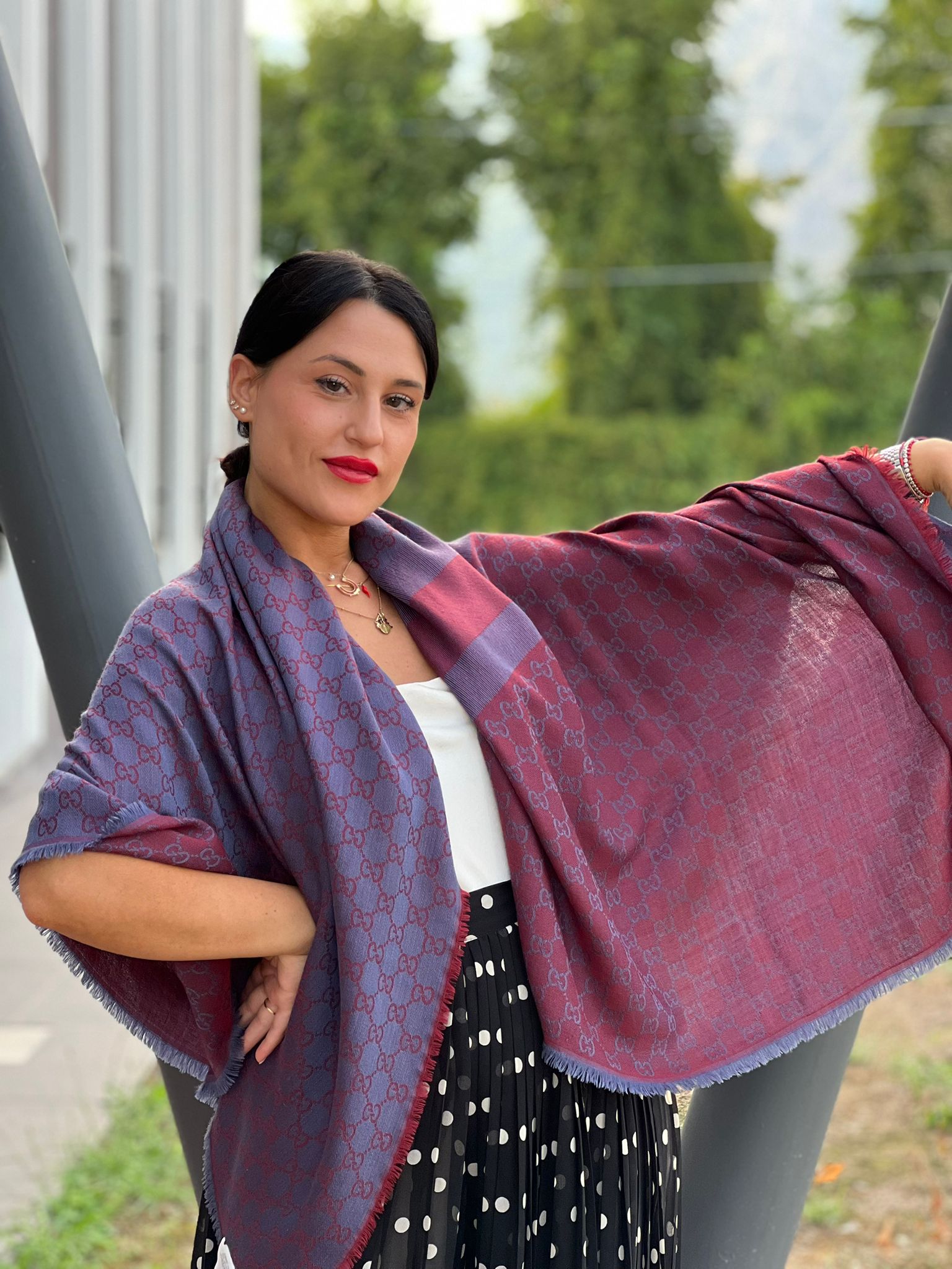 Descrizione: Scialle Gucci in misto lana e seta bicolore; bordeaux e blu con trama GG, e bori sfrangiati. Completo di scatola