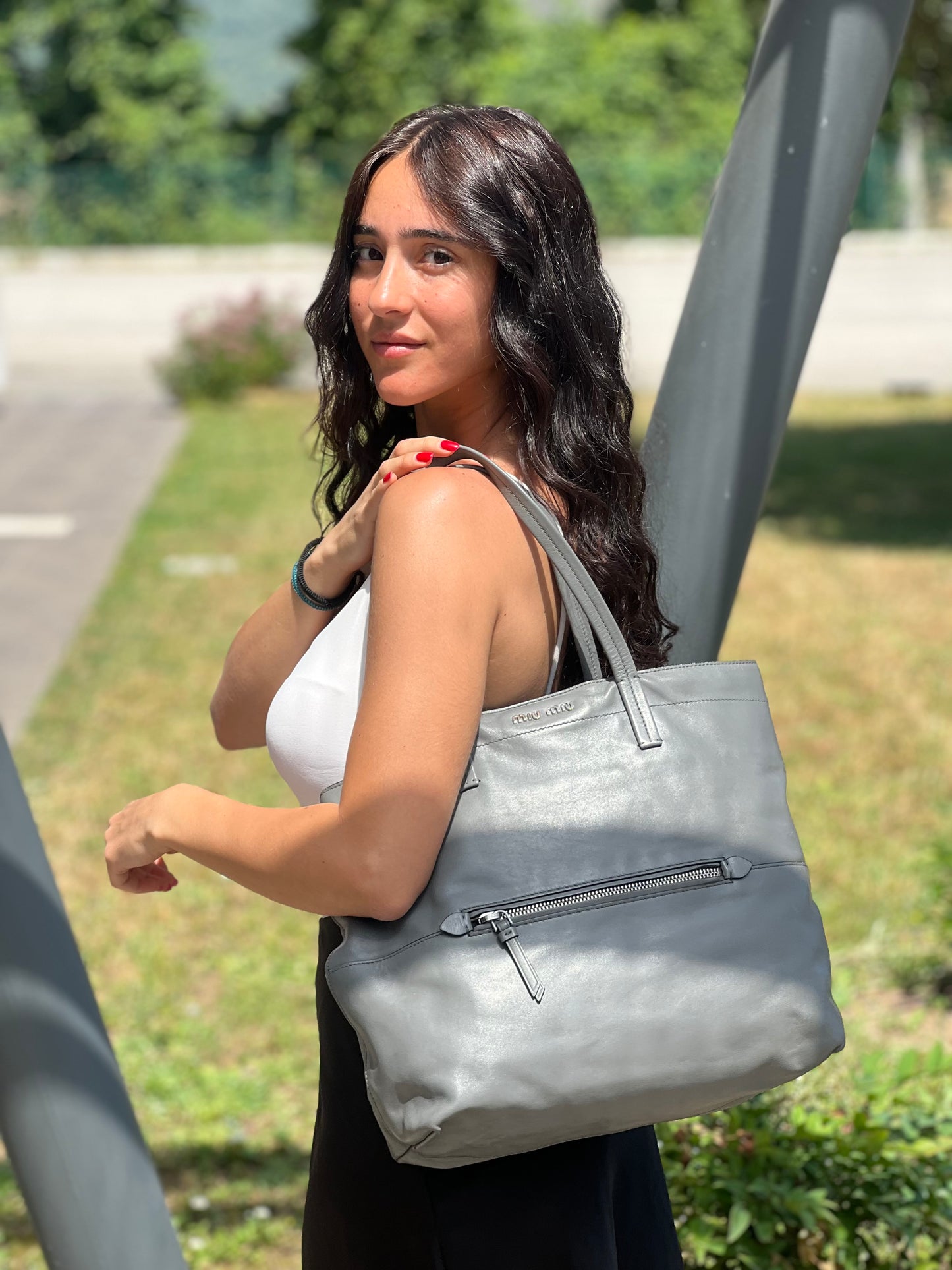 Descrizione: Borsa Miu Miu in pelle grigia con parti metalliche argentate. Munita di doppi manici, tasca con cerniera sul front e rifinita con logo lettering in metallo. Completa di dustbag.