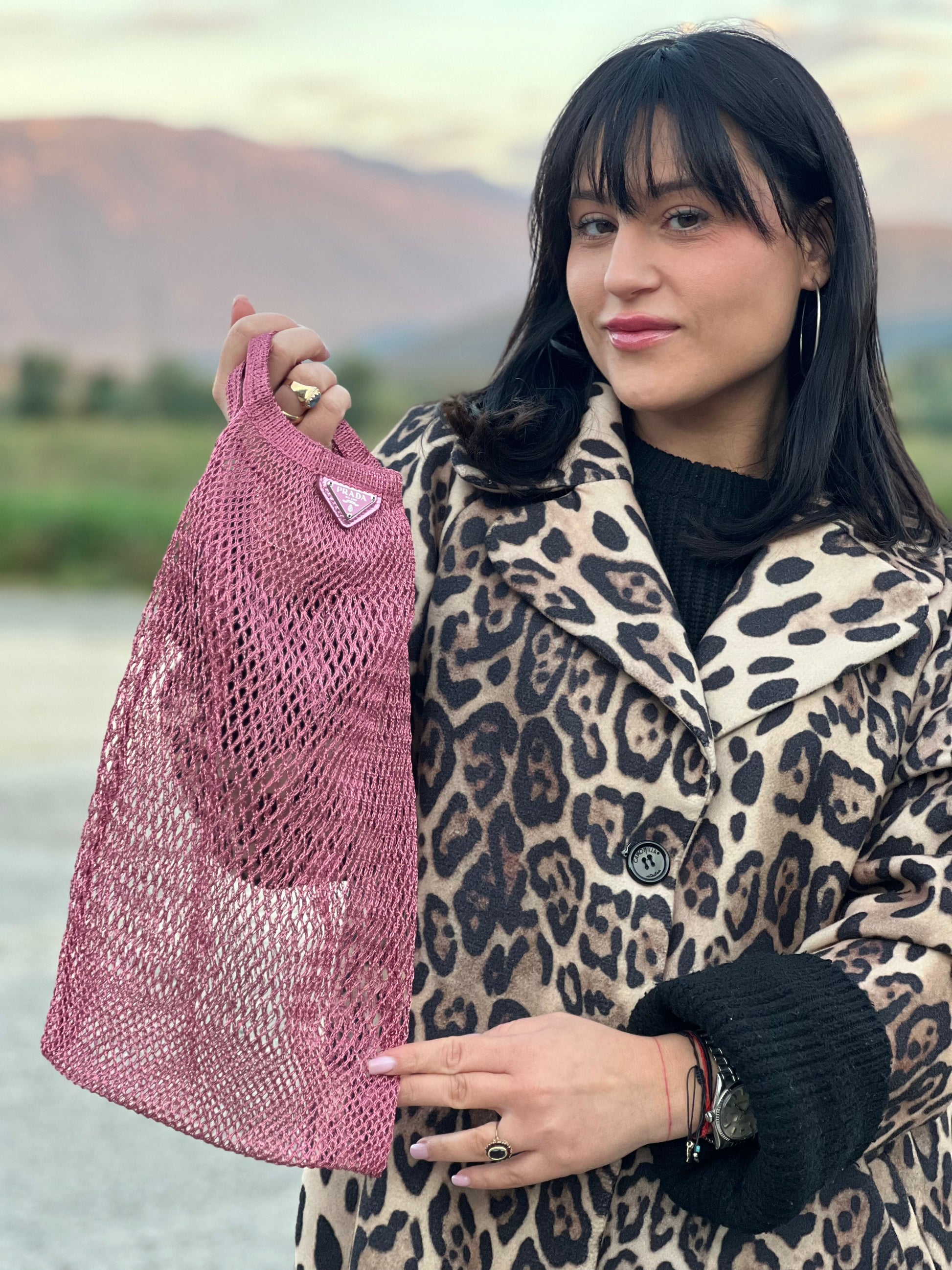 Descrizione: Borsa Prada in nylon effetto rete in maglia color rosa metallico con parti metalliche argentate. Completa di scatola