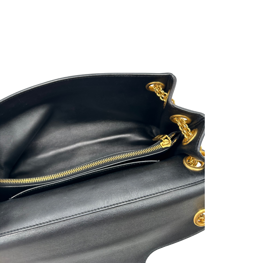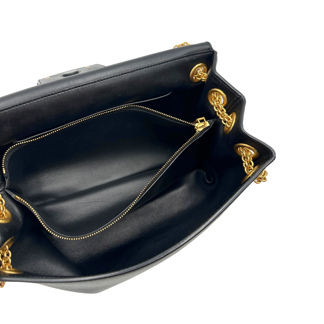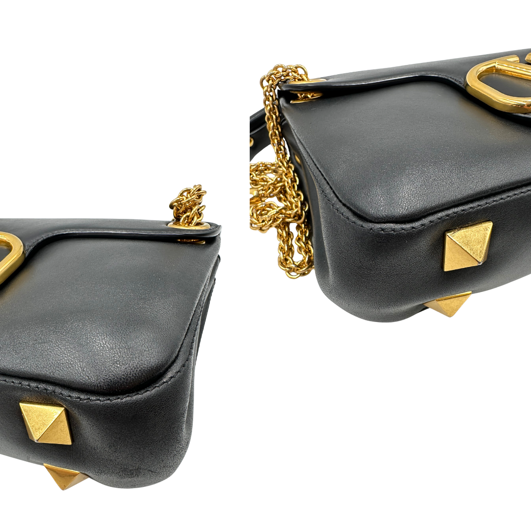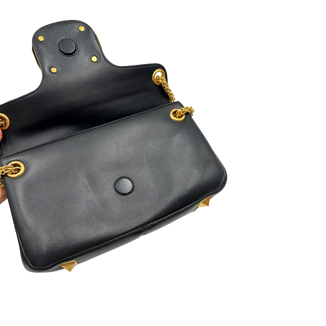 Descrizione: Borsa Stud Sign Valentino Garavani in pelle nera con parti metalliche dorate e tracolla in catena scorrevole con borchie piramidali dorate sullo spallaccio. Completa di dustbag.