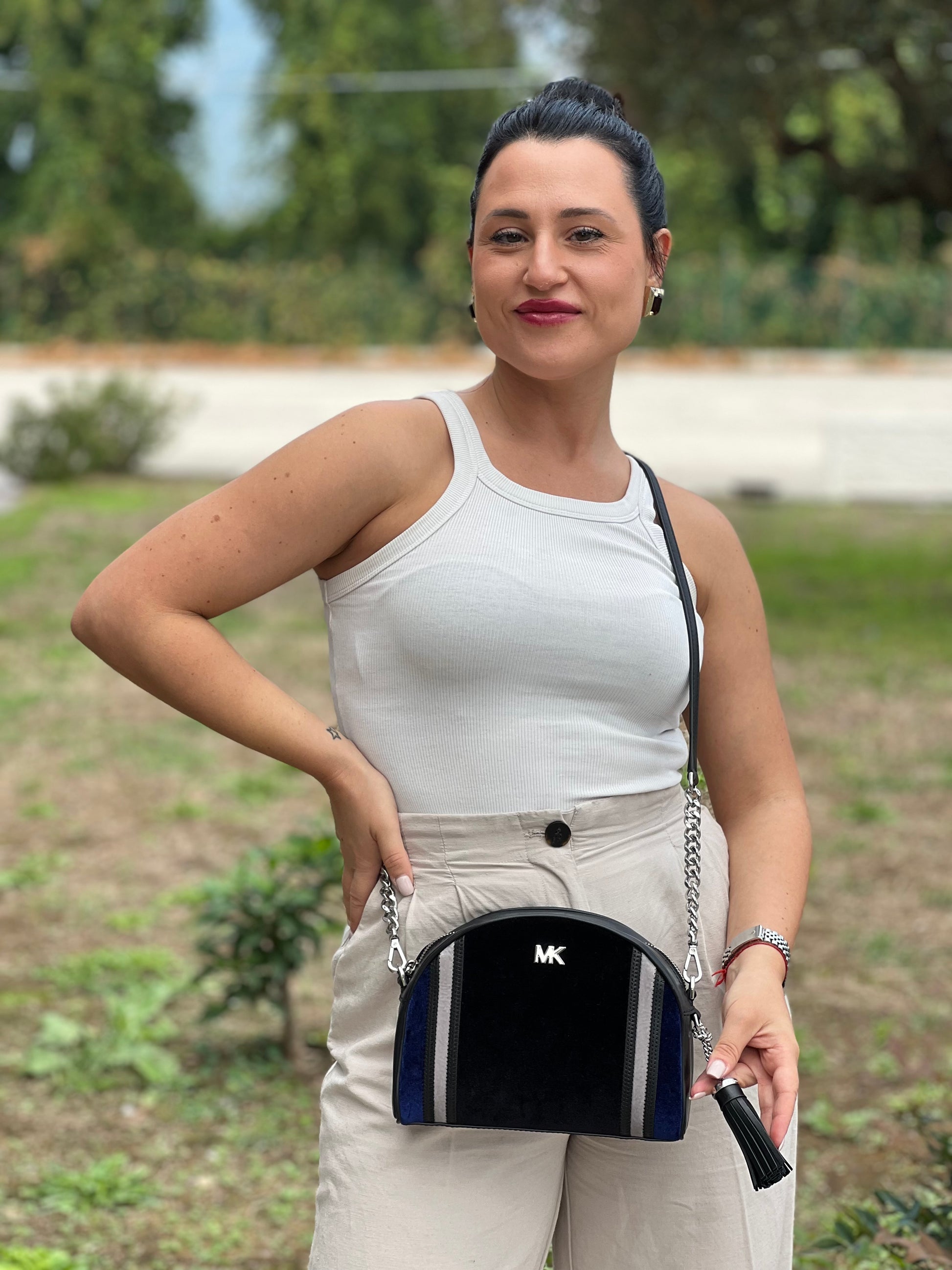 Descrizione: Borsa Michael Kors in pelle nera, e velluto sul front con dettagli blu e bianchi. Munita di tracolla regolabile e amovibile, impreziosita da una nappa decorativa. Rifinita con parti metalliche argentate.