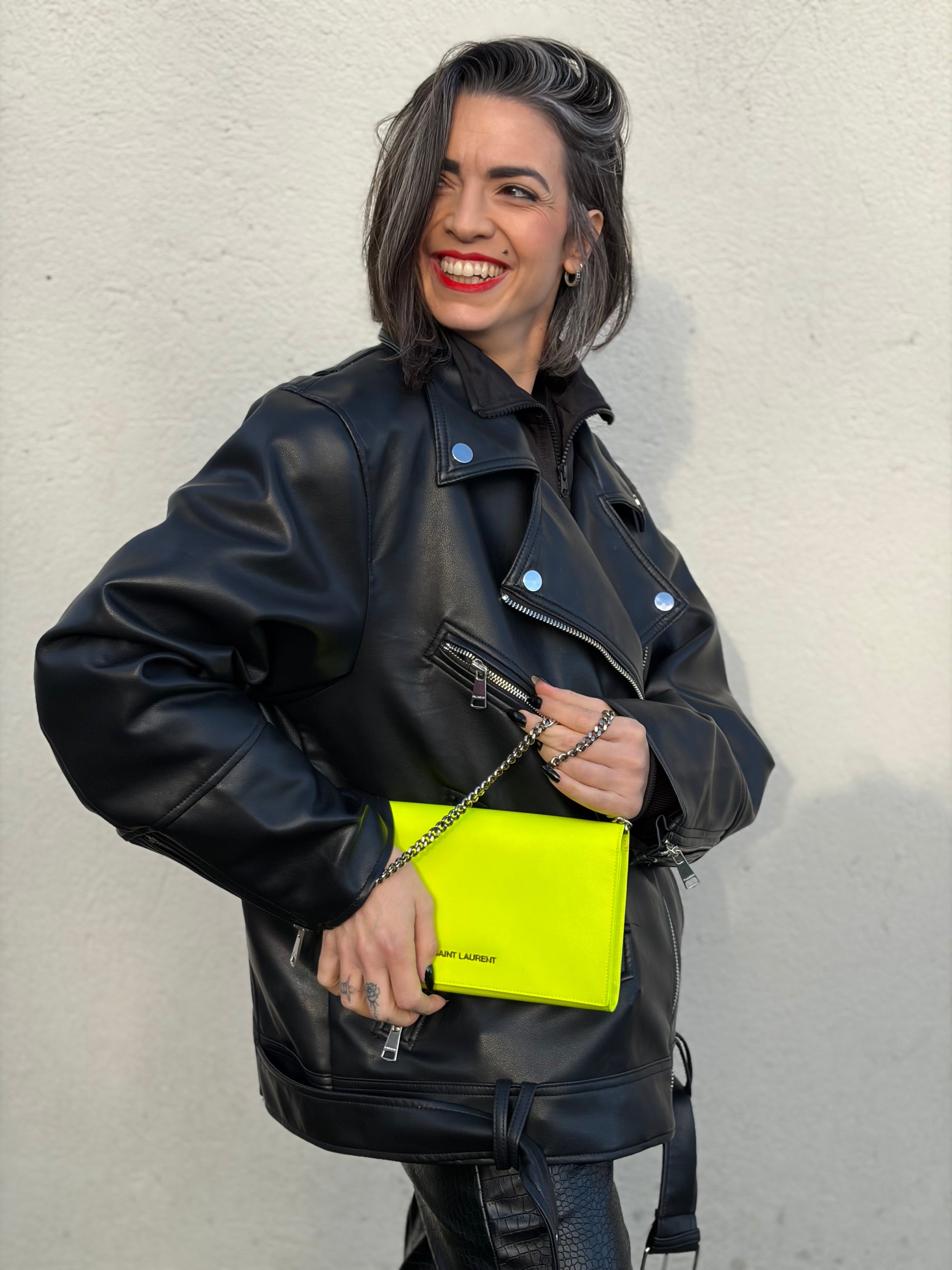 Descrizione: Wallet Saint Laurent in pelle giallo fluo con manico in catena argentata, rifinito con logo lettering sul front. Completo di corredo