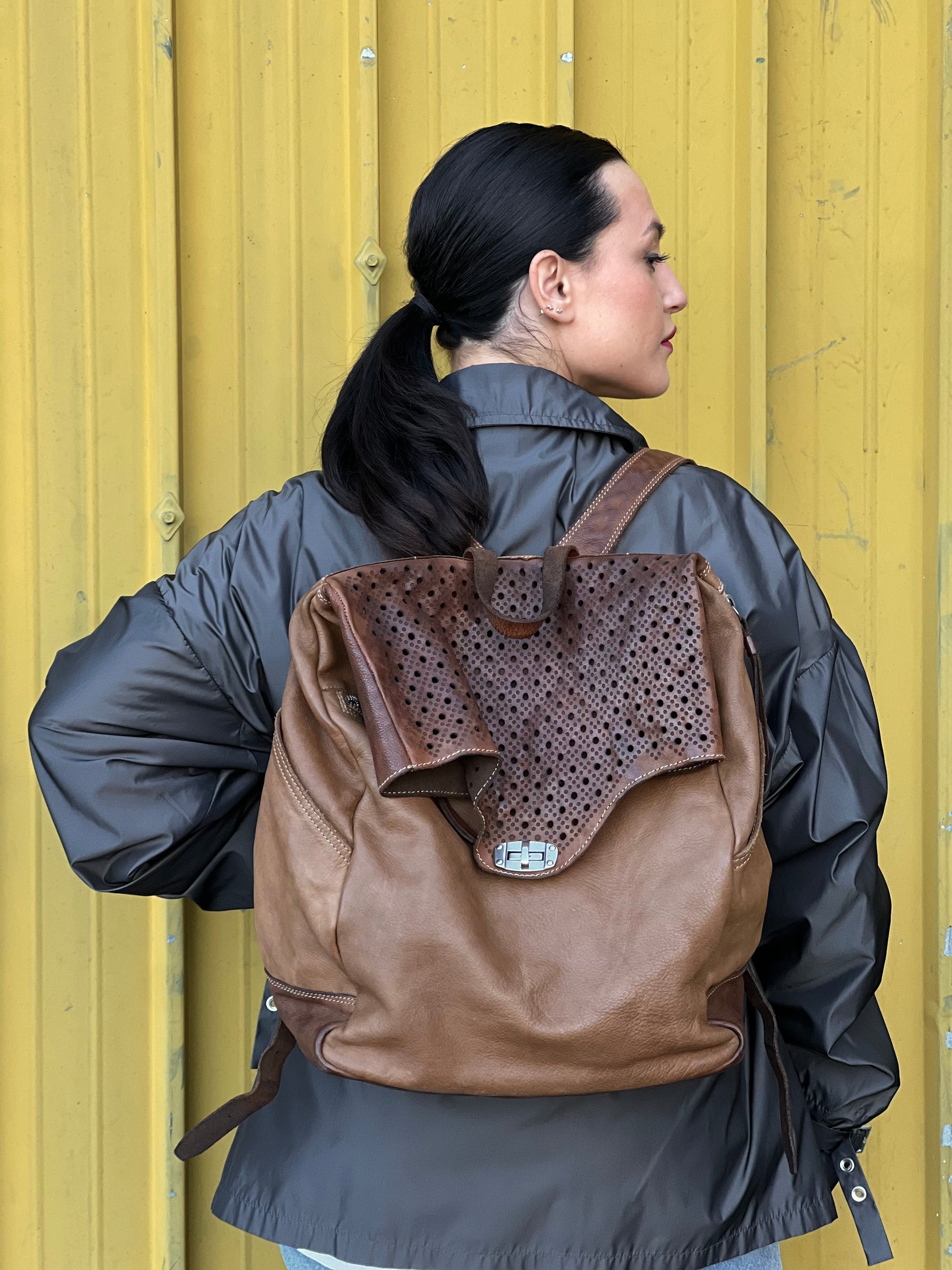 Descrizione: Zaino in pelle marrone cognac con lavorazione laser geometrico, rifinito con parti metalliche argentate. Completo di dustbag.