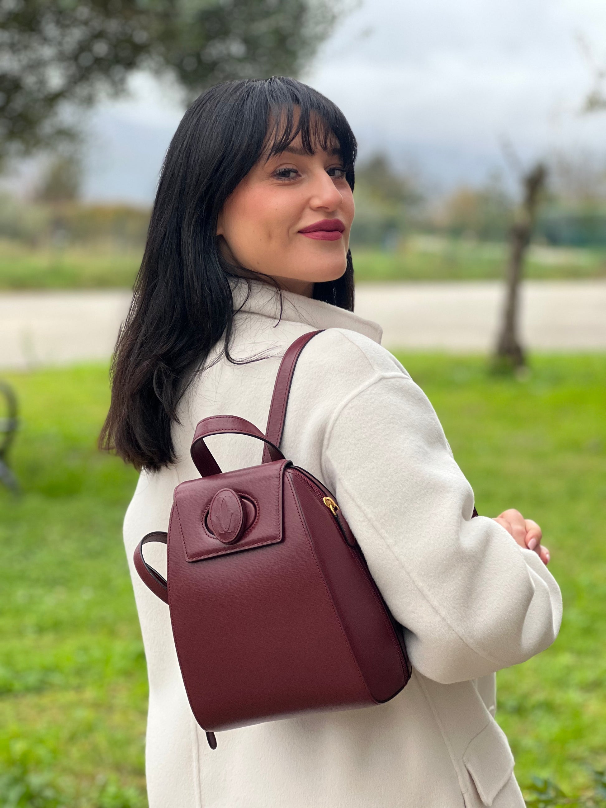 Descrizione: Zaino Cartier in pelle bordeaux con parti metalliche dorate; munito di un manico e di bretelle con fibbia regolabili. Munito di card d'autenticità.