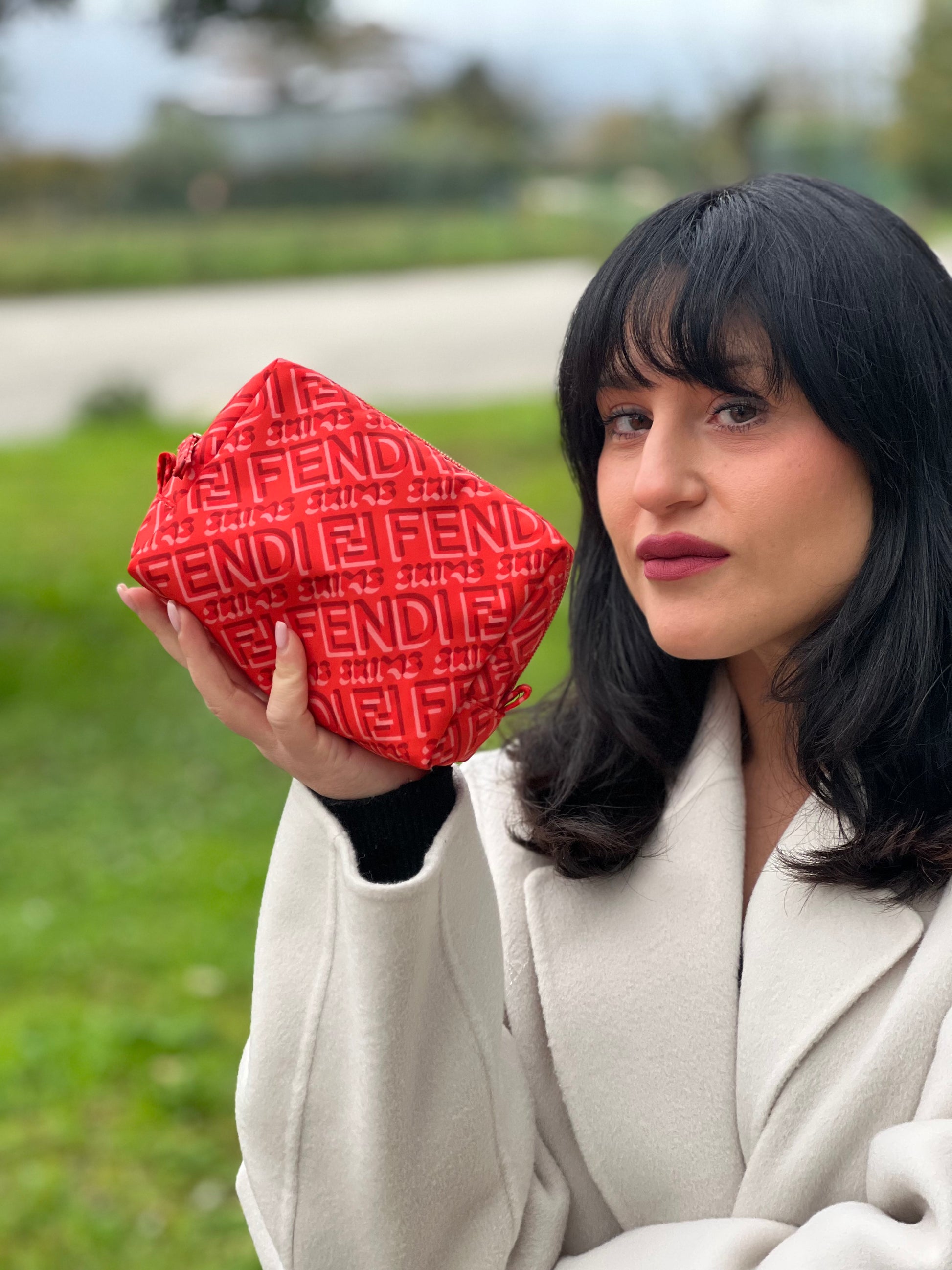 Descrizione: Beauty Fendi in nylon color tulipano con iconico logo su tutta la superficie e parti metalliche dorate.