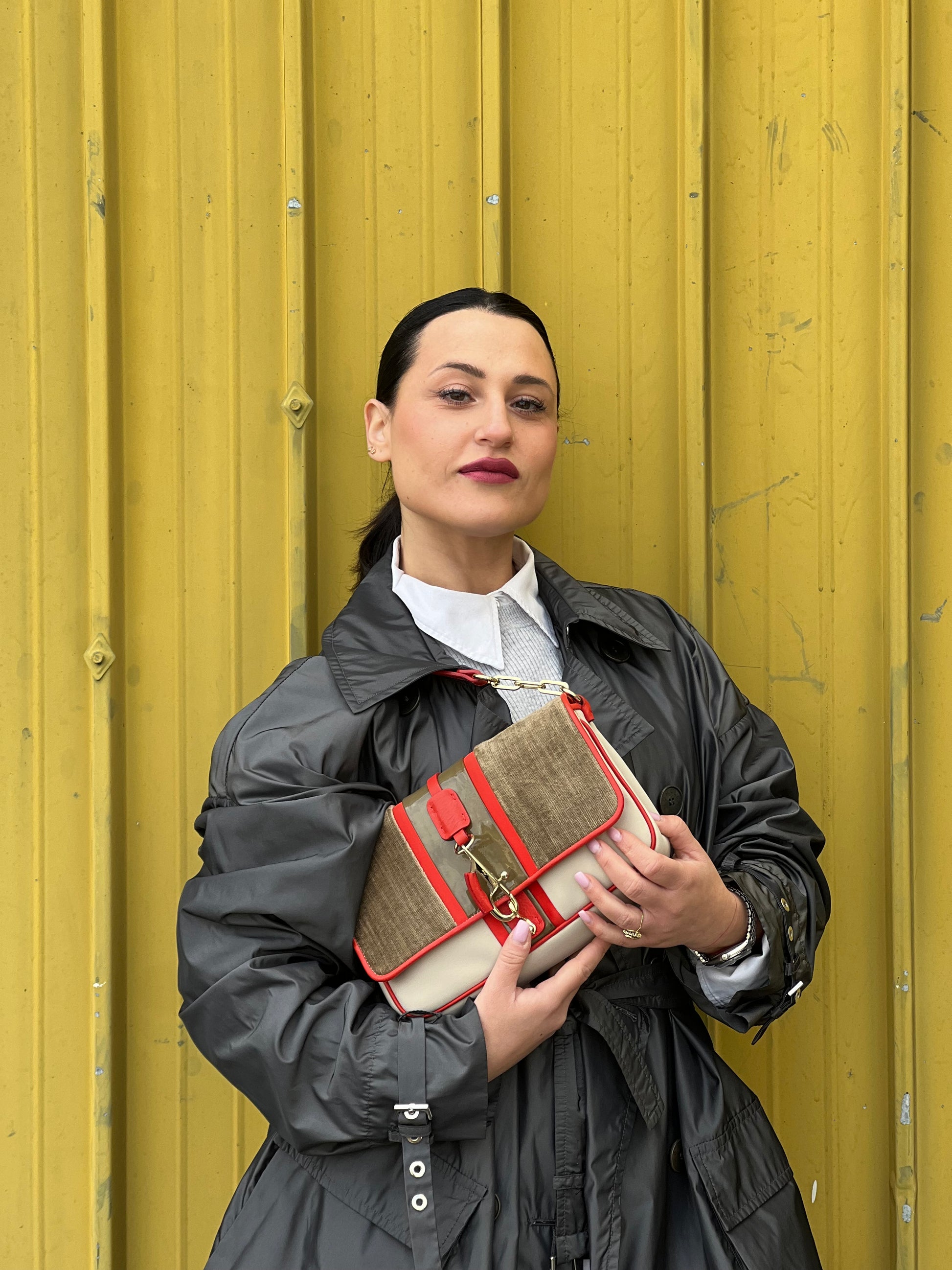 Descrizione: Pochette Fay in tessuto, pelle scamosciata e pelle vernis nelle tonalità del beige. Finiture arancio fluo e metalleria dorata. Completa di dustbag