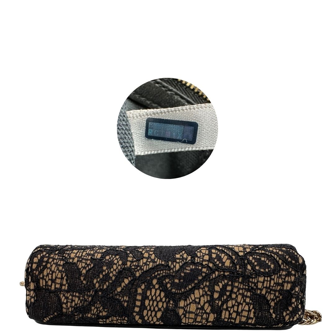 Descrizione: Borsa Jimmy Choo in tessuto nude impreziosita da pizzo nero, con parti metalliche dorate; munita di una tracolla in catena. Completa di corredo
