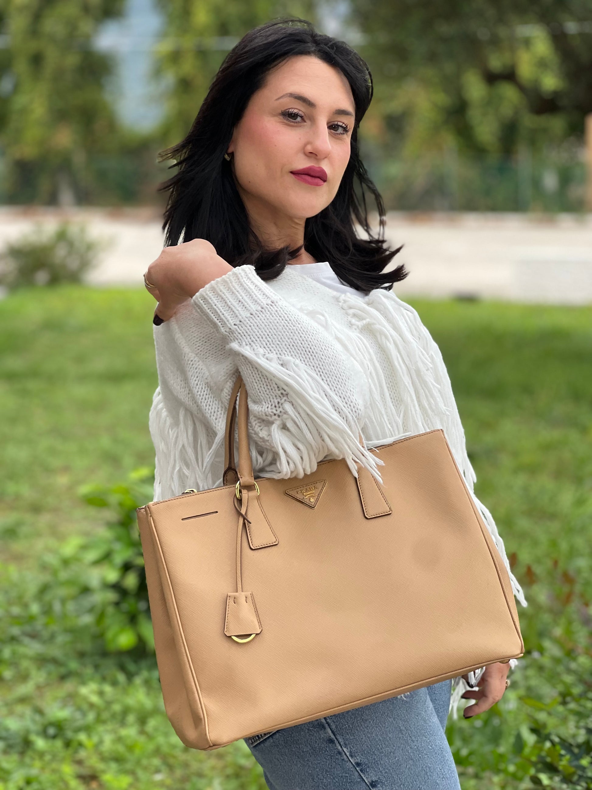 Descrizione: Borsa Prada in pelle saffiano color nocciola con parti metalliche dorate; munita di doppi manici stondati e impreziosita da una clochette portachiavi. Completa di dustbag.