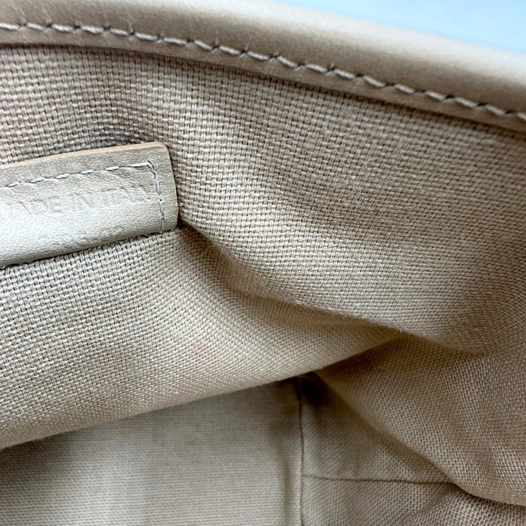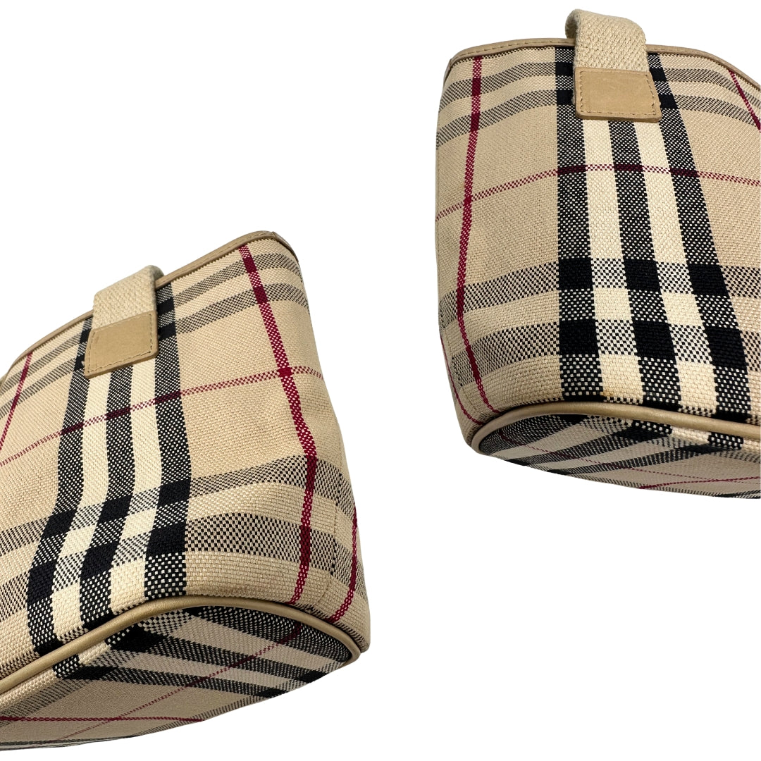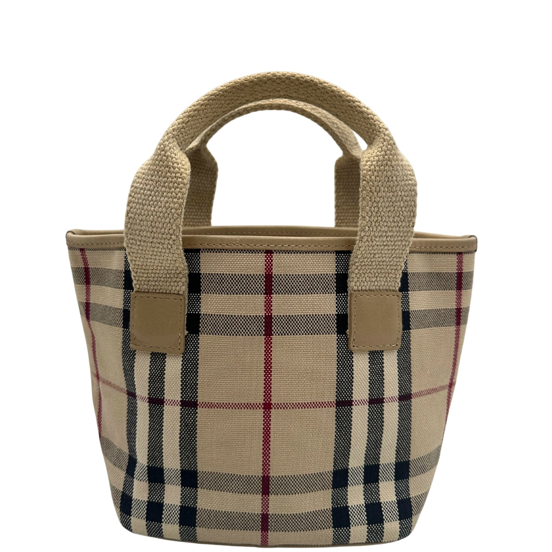Descrizione: Borsa Burberry in tessuto beige con trama tartan, rifinita con parti in pelle beige; indossabile a mano.
