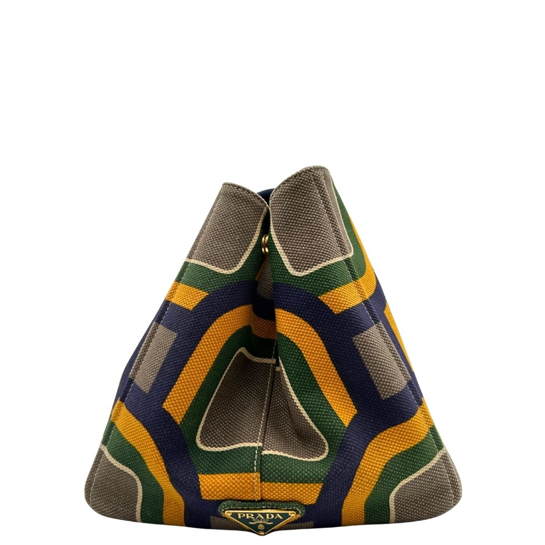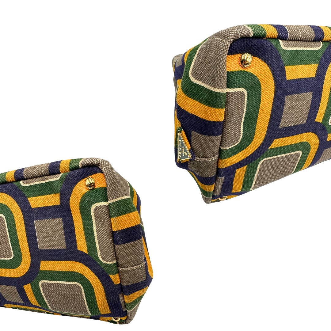 Descrizione: Borsa Prada in tessuto beige, verde, giallo e blu con parti metalliche dorate; munita di doppi manici, da portare a mano.