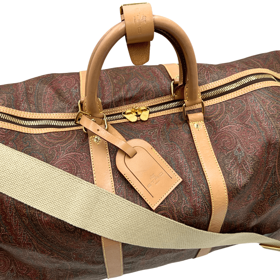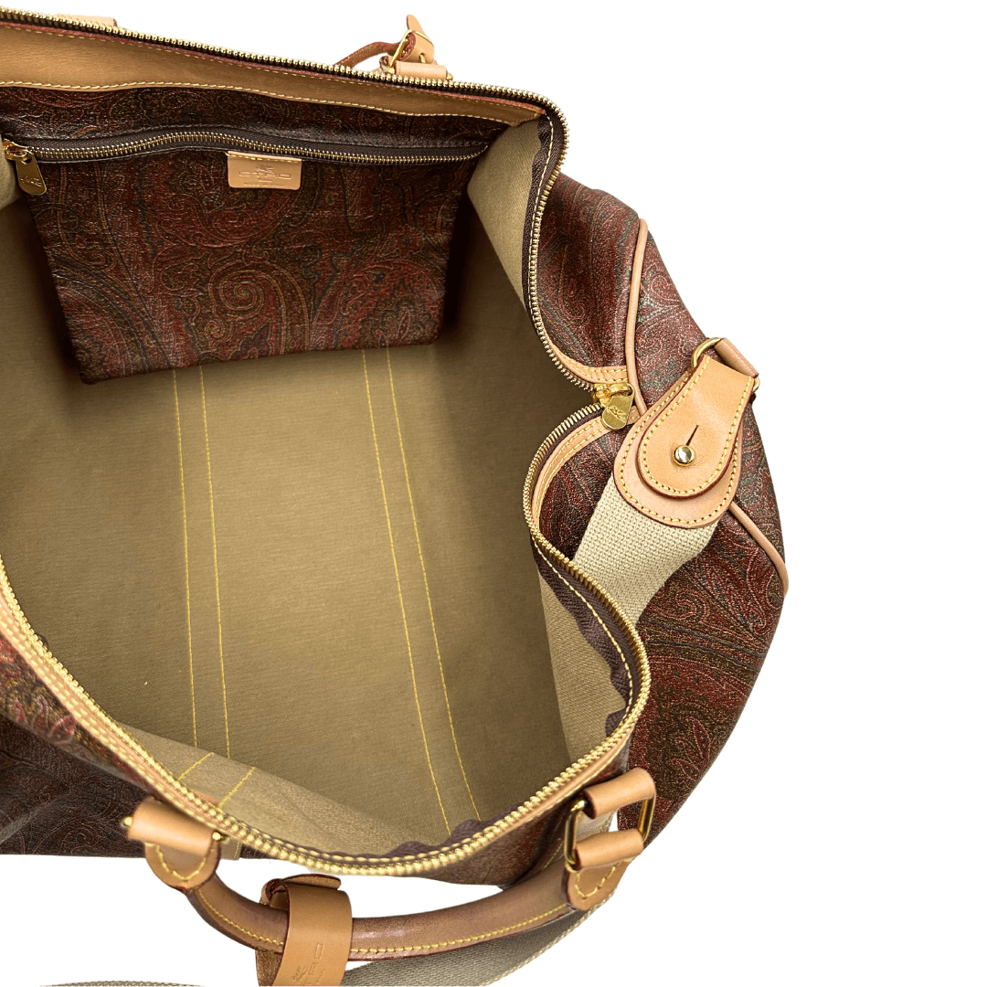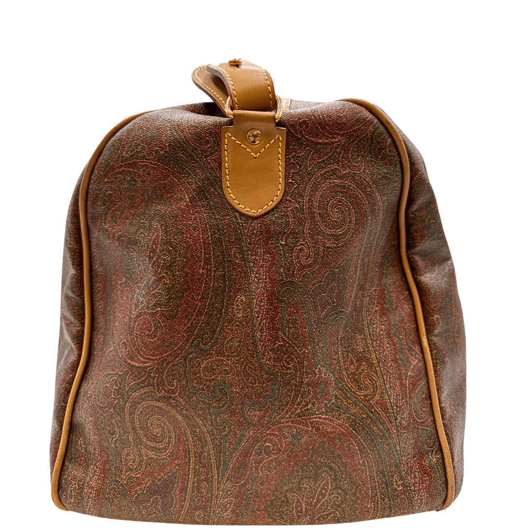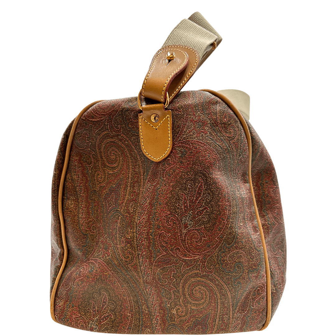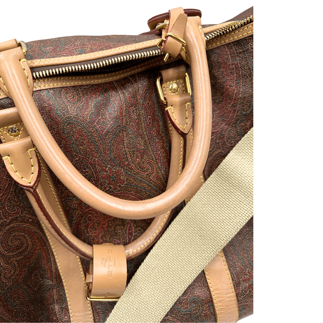 Descrizione: Borsone Etro in canvas multicolore trama Paisley con finiture in pelle color cammello e parti metalliche dorate.