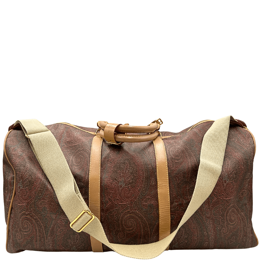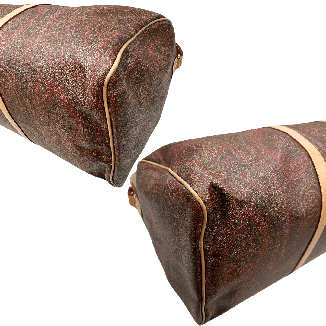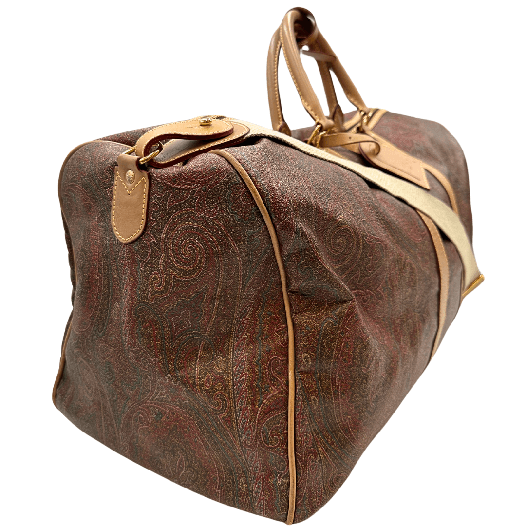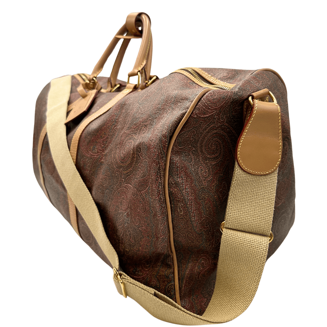 Descrizione: Borsone Etro in canvas multicolore trama Paisley con finiture in pelle color cammello e parti metalliche dorate.