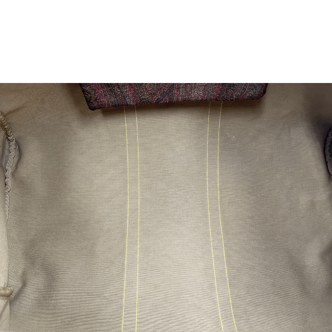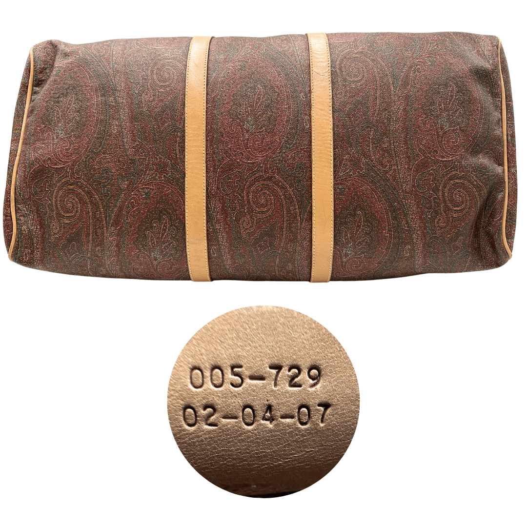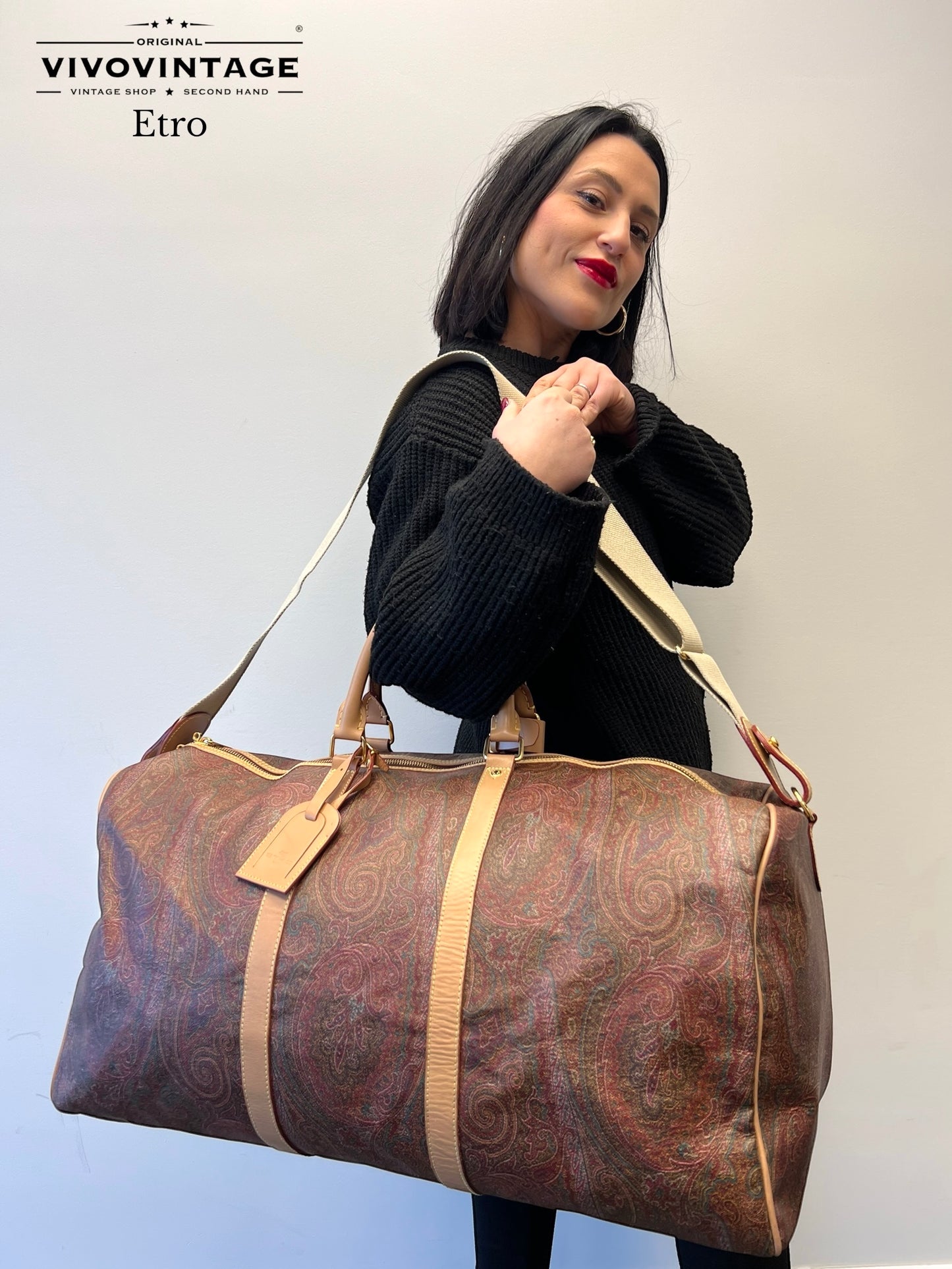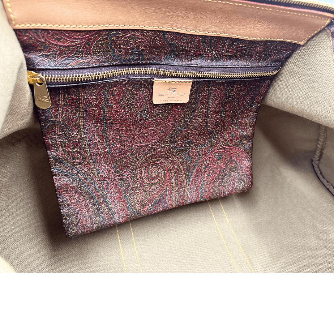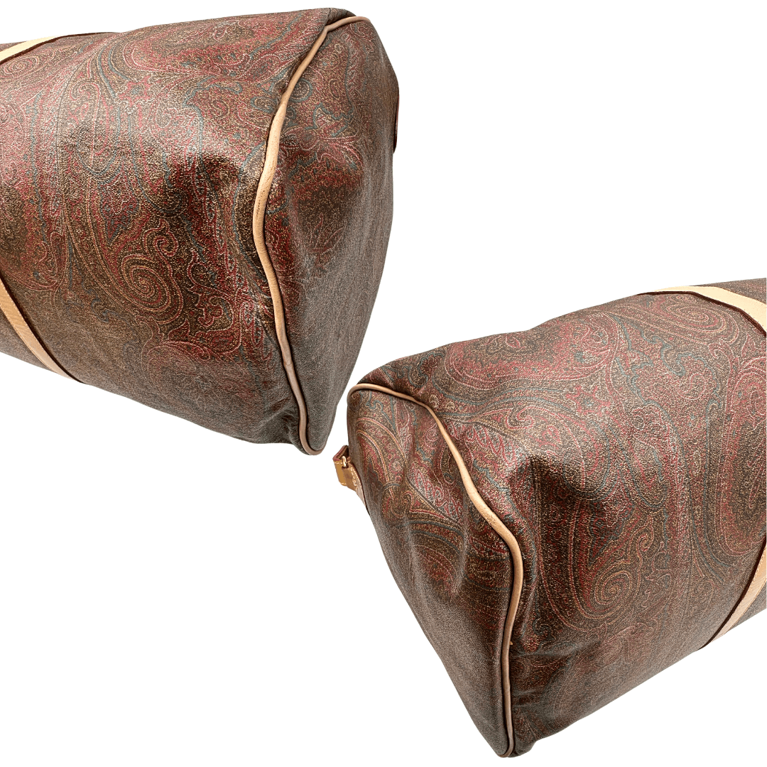 Descrizione: Borsone Etro in canvas multicolore trama Paisley con finiture in pelle color cammello e parti metalliche dorate.