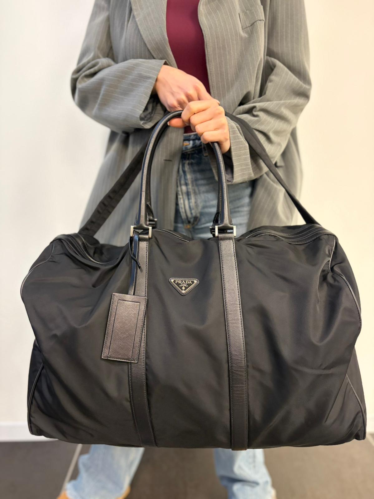 Descrizione: Borsone Prada in nylon nero con finiture in pelle tono su tono e parti metalliche argentate; munito di doppi manici stondati e un manico singolo in tessuto, indossabile a spalla o mano. Completo di dustbag e tag porta address.