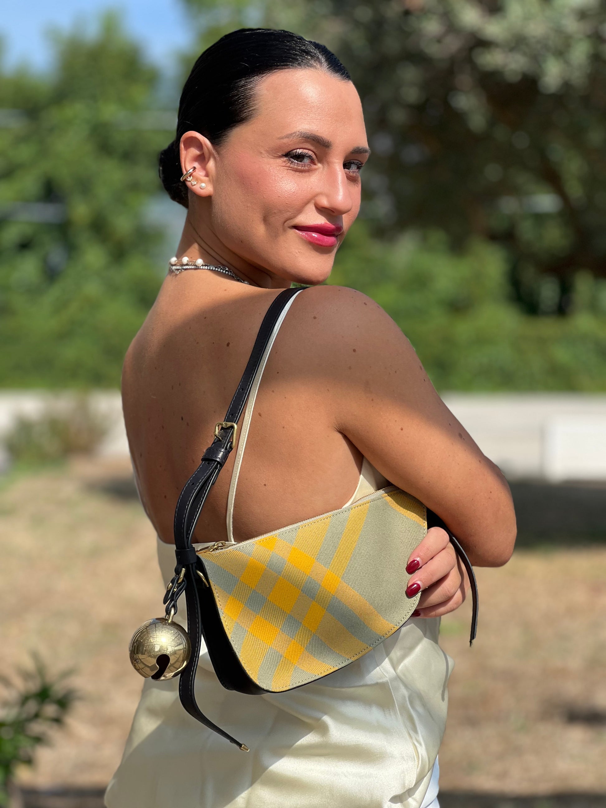 Descrizione: Borsa Burberry in tela verde e gialla con trama tartan, finiture in pelle nere e parti metalliche dorate. Completa di dustbag