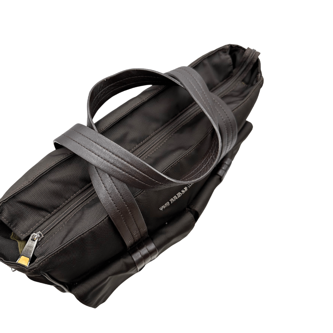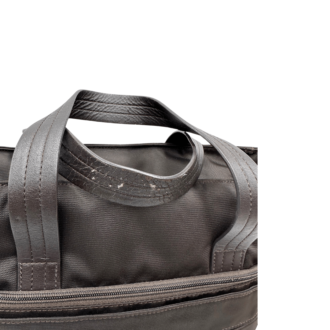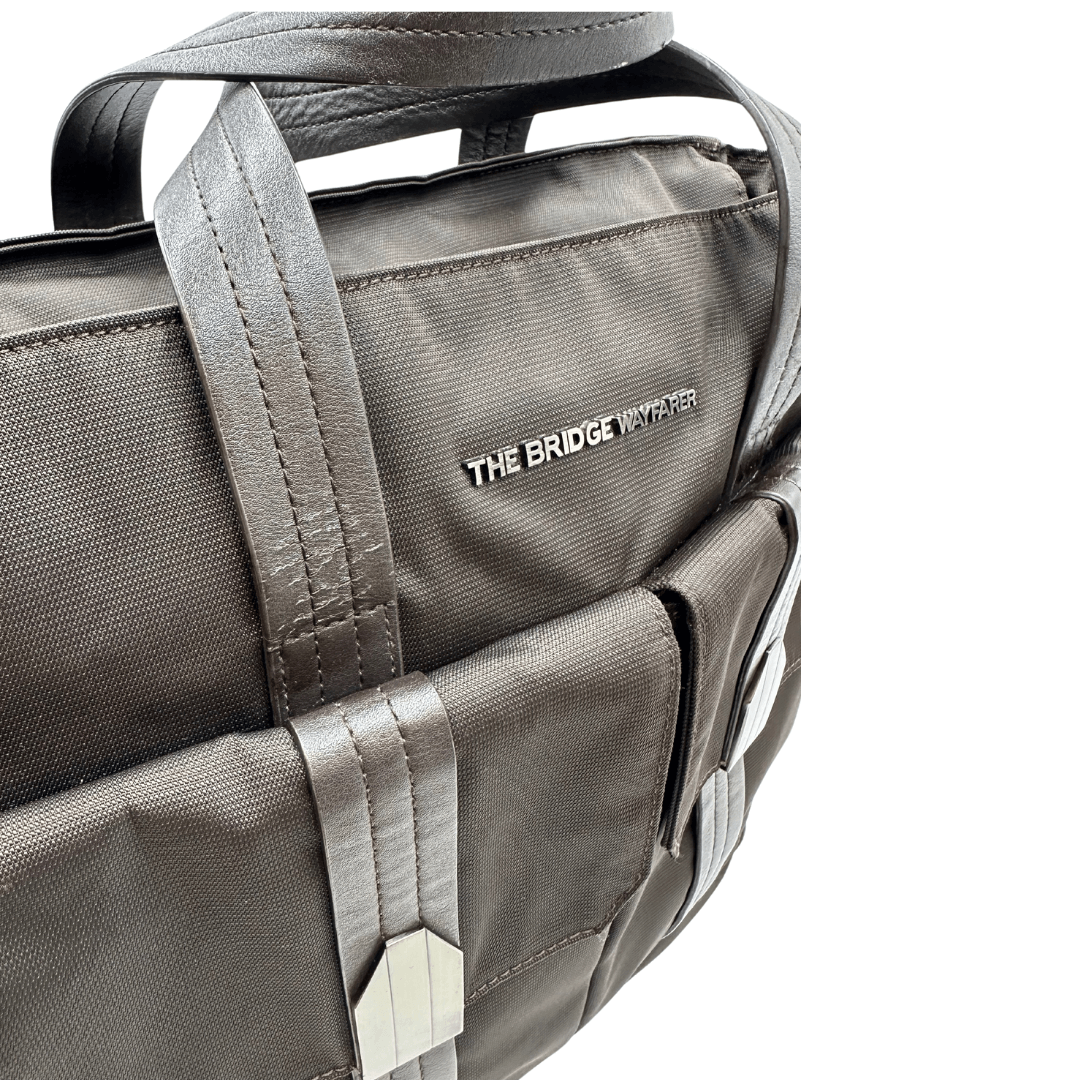 Descrizione: Cartella The Bridge in tessuto testa di moro con finiture in pelle tono su tono e parti metalliche argentate. Doppi manici in pelle e tracolla in tessuto regolabile e amovibile.