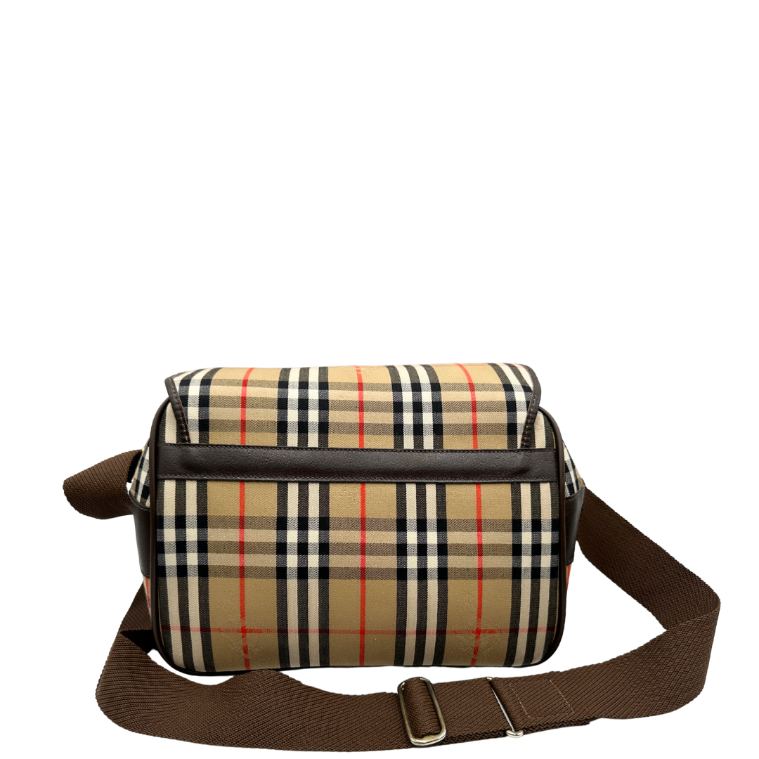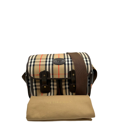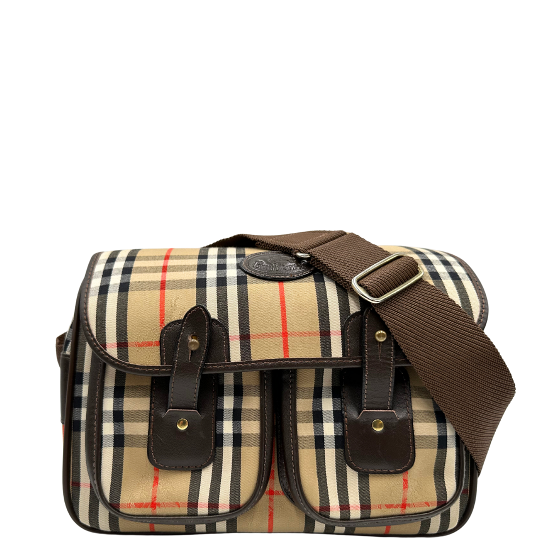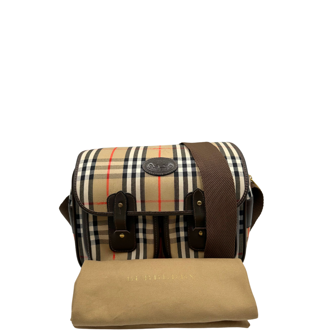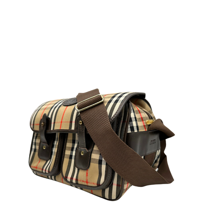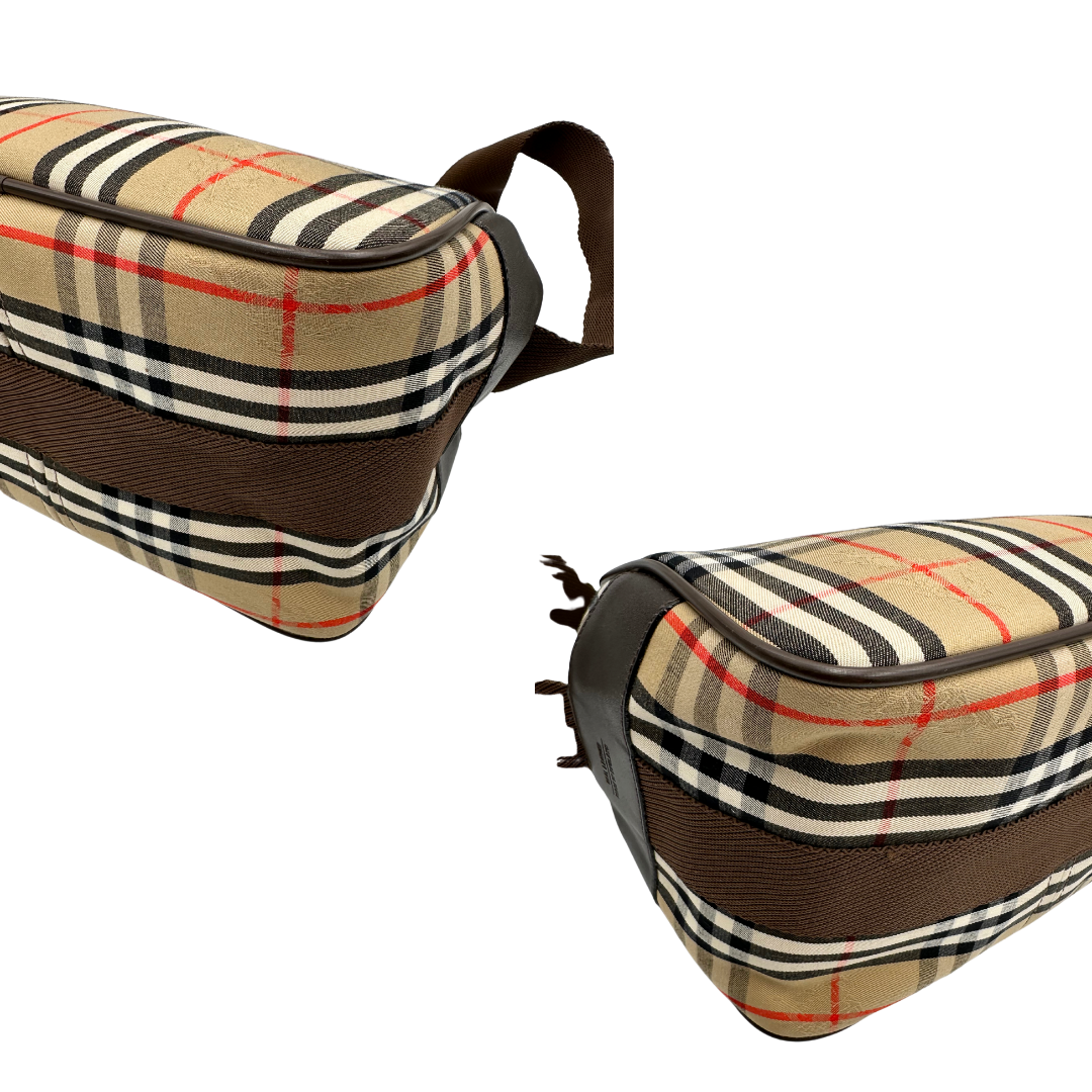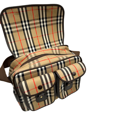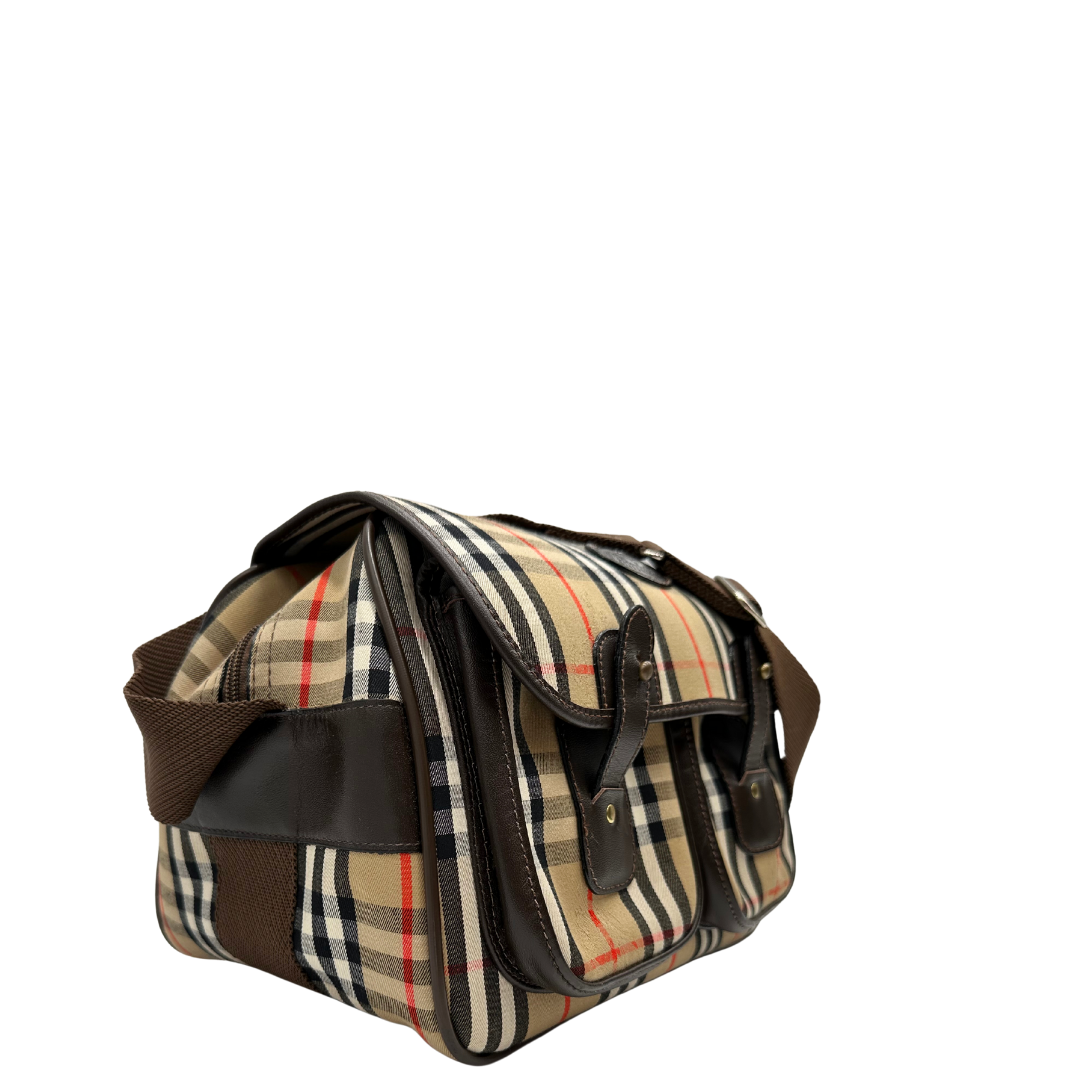 Descrizione: Cartella Burberry in tessuto beige tartan con finiture in pelle testa di moro, tracolla in tessuto regolabile e parti metalliche dorate. Completa di dustbag